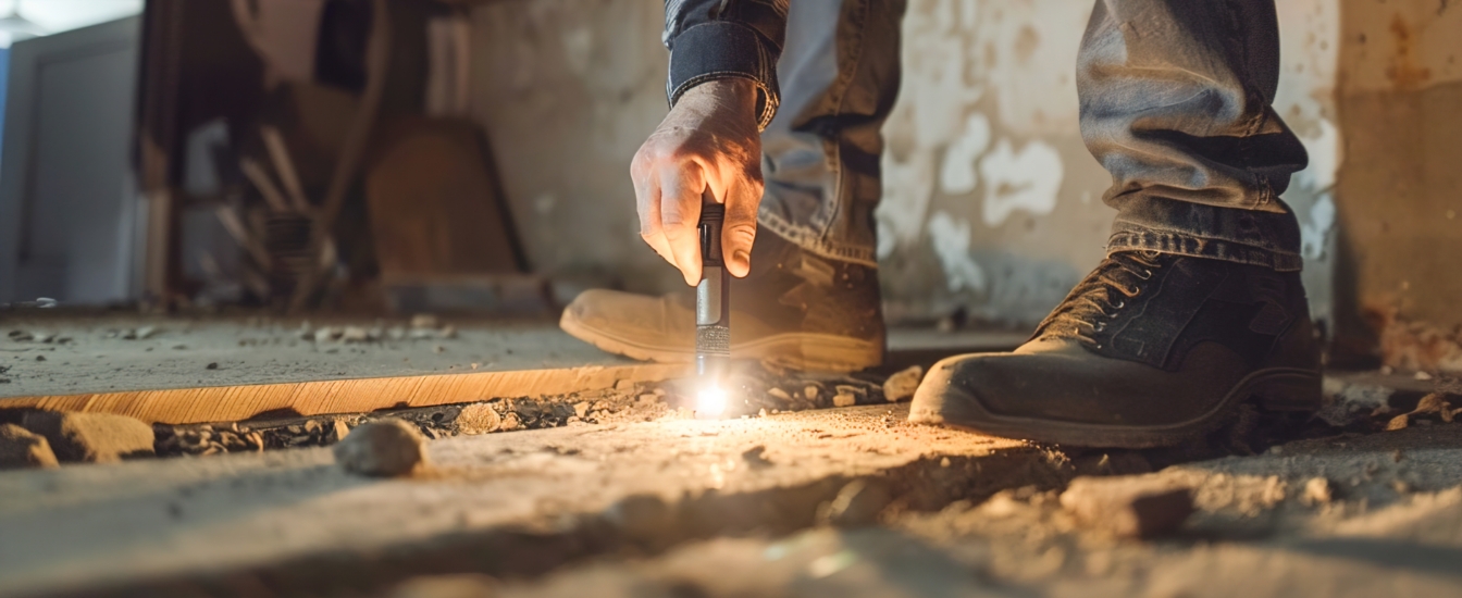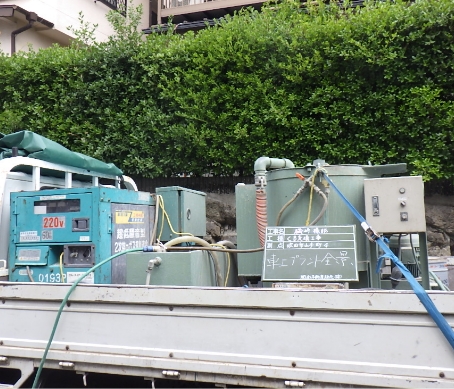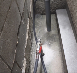 地上から建物の基礎部の空洞に向けて、CB(セメント・ベントナイト)注入を行い、空洞を埋めて家屋の地盤改良を行う工法です。