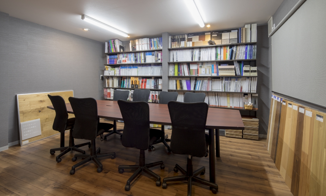 店内は素材の上質感を活かしたモダンな空間になっています。商談スペースも多数用意しておりますので、お住まいに関するご希望やお悩みをゆっくりお聞かせください。