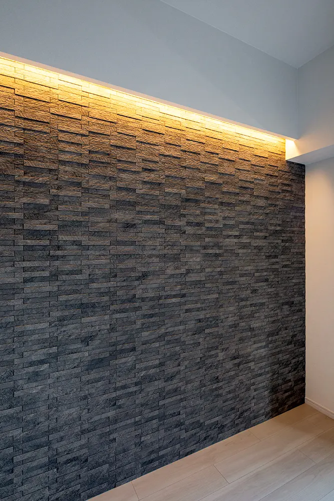 リビングのエコカラットには、木漏れ日のように壁を照らす癒しのコーニス照明を組み合わせました。視界に入りやすい場所なので、LDKのどこにいてもその温かな光を眺めながら過ごすことができます。さらに、キッチンとダイニングの間にある壁を取り払うことで、開放的なまとまりがある空間に。
