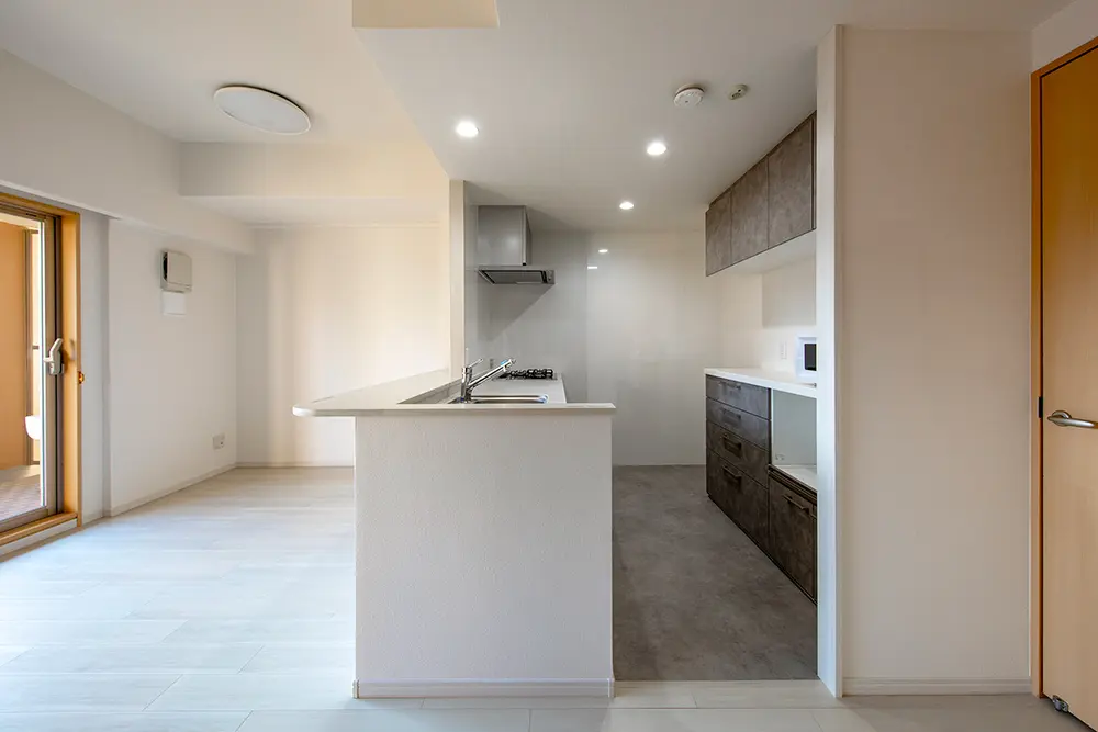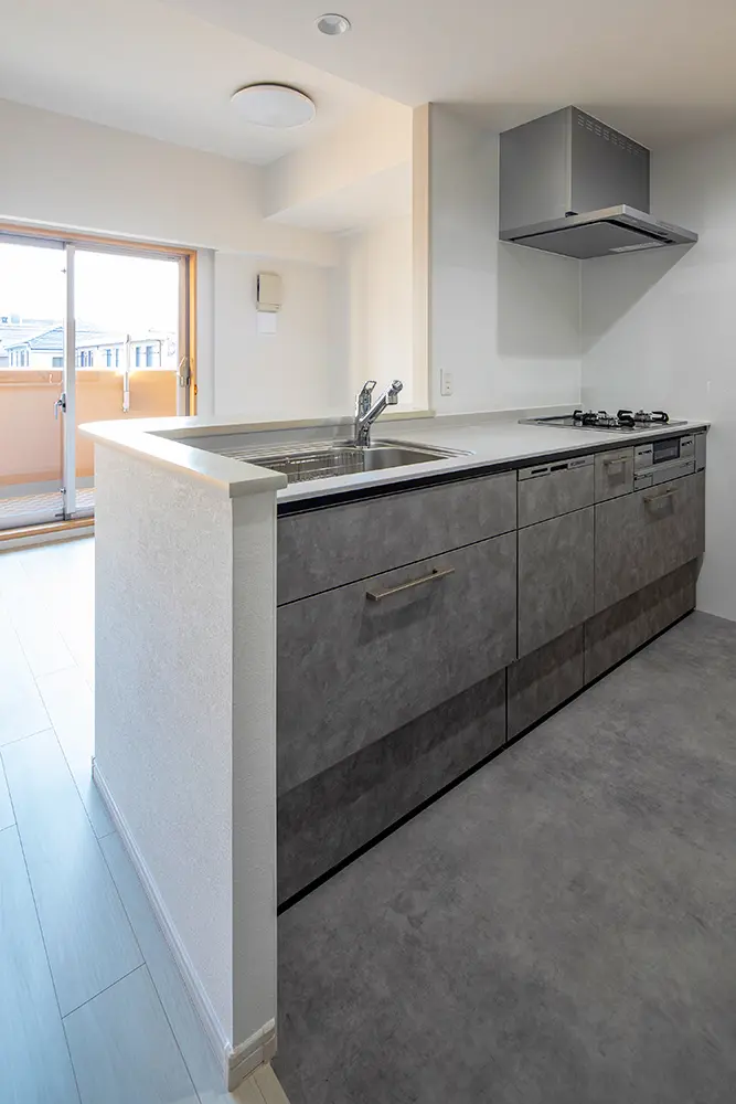 グレーカラーのエコカラットやキッチン、クッションフロアを新しく取り入れた住まい。