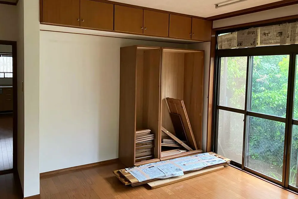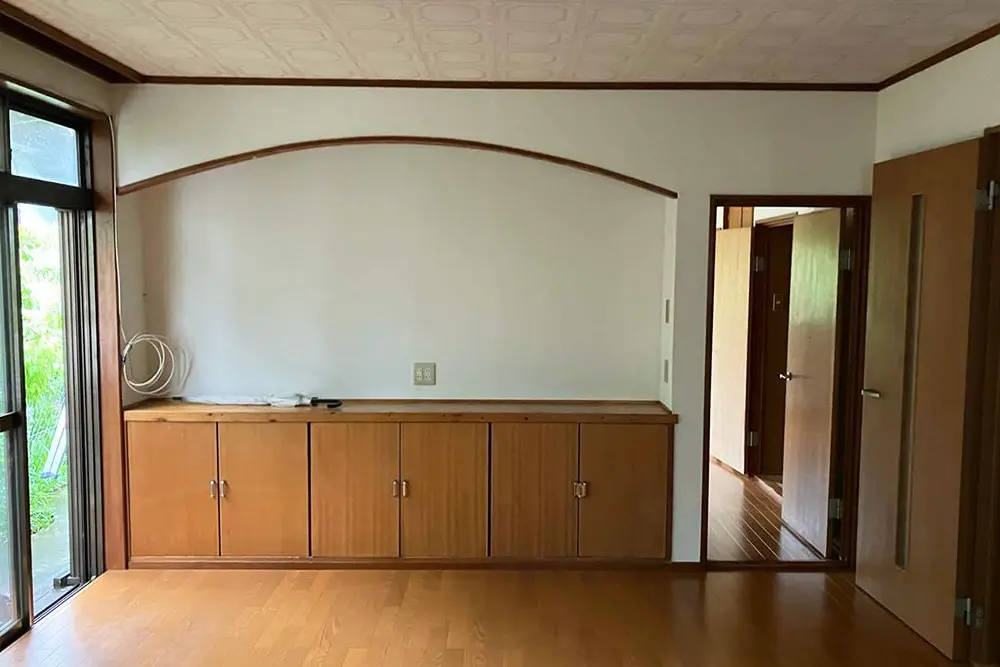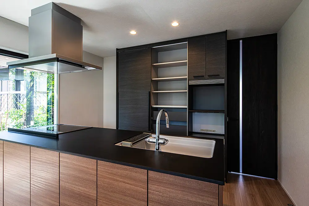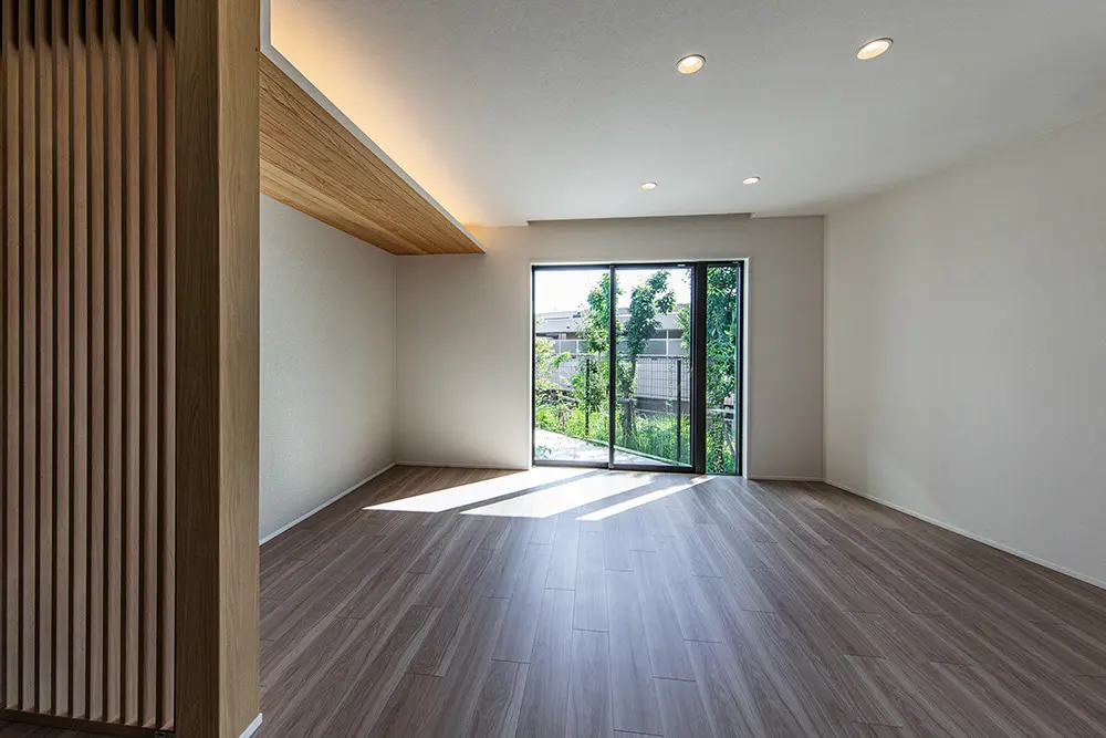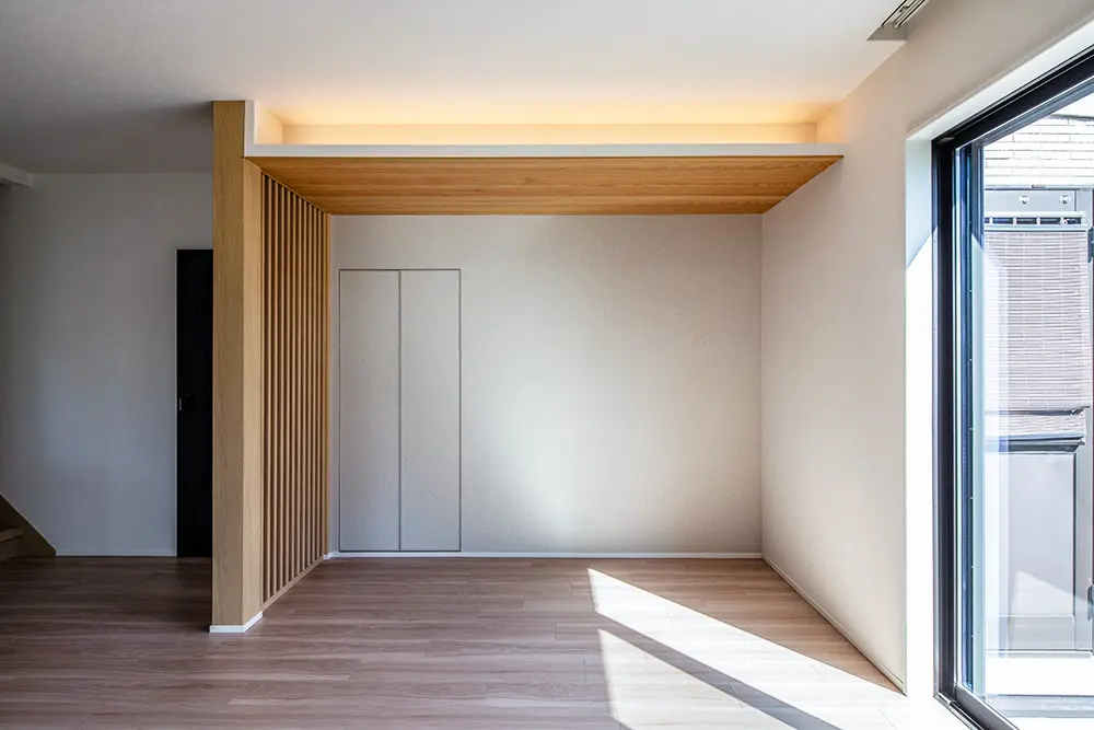 優しい風合いのフローリングカラーをベースに、対面キッチンのブラックとウォルナットが締め色として映える洗練されたメイン空間。意匠性と機能性に優れた、大型の引き戸付きのカップボードを設置することで、ご家族やご友人と過ごすLDKをスッキリと整えてくれます。リビングには、アクセントになる木目調の下がり天井と優しい光のコーブ照明を計画。既存柱を活用するため、横にはデザイン性に優れた木格子をあしらいました。また、以前は廊下だった壁を取り払い、間口の広い開放的なLDKに仕上げています。