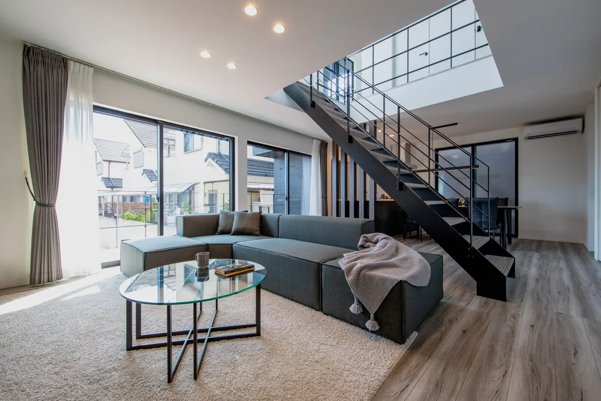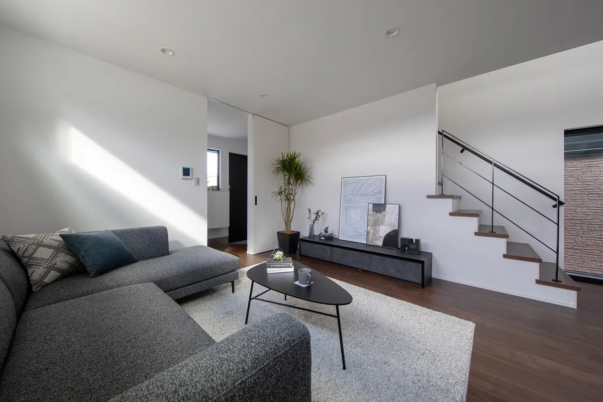 リビング階段を中心にL字型に広がるLDKは、空間を緩やかに繋げ開放感と一体感を生み出しています。 インテリアからアクセントクロスまでグレートーンで統一することで、落ち着きのある佇まいに。 充実した収納スペースが日々の暮らしをすっきりと整え、心が安らぐ上質な邸宅です。