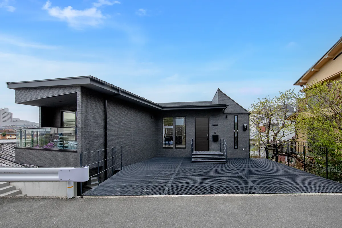 道路より高い位置に配し、外からの視線を遮ることで、上質なプライベート感を確保した住まい。 落ち着いた色合いで統一したLDKは、家族がゆったりとくつろげる心地よい空間に仕上げました。 寝室には隠れ家のような遊び心が感じられるロフトを設け、家族それぞれが愉しめる邸宅です。