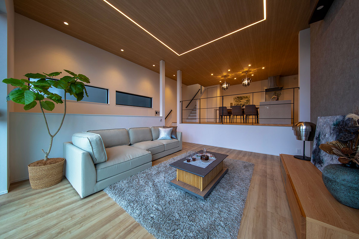 開放感を呼び込む吹抜けを設けた広々LDK。 リビング階段を採用し、家族が自然とひとつの空間に集まりやすくなります。 交流深まる豊かな時間が流れる、心地よい住まいです。