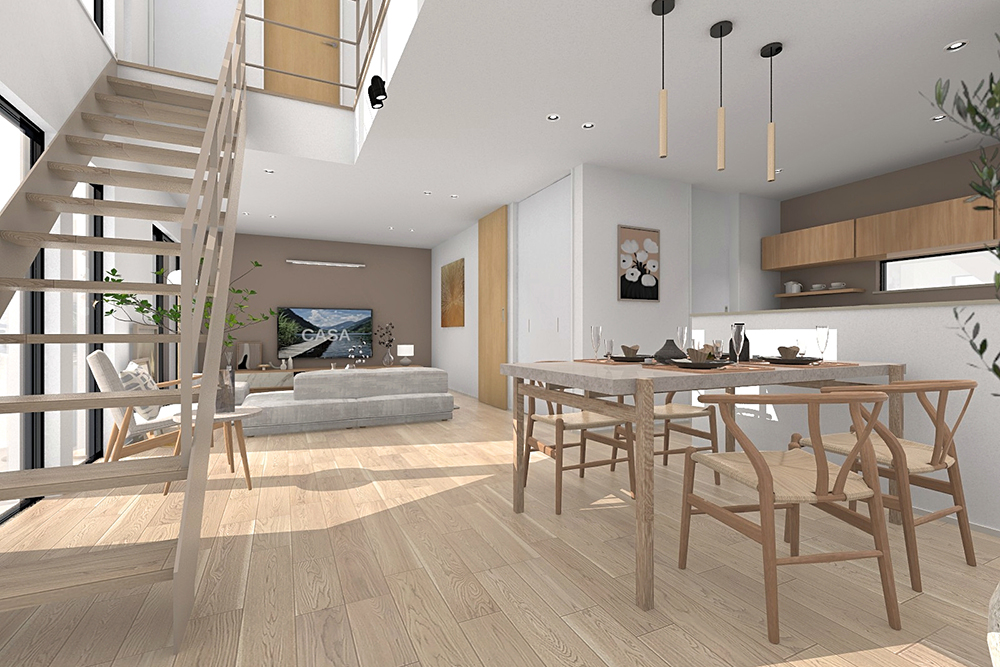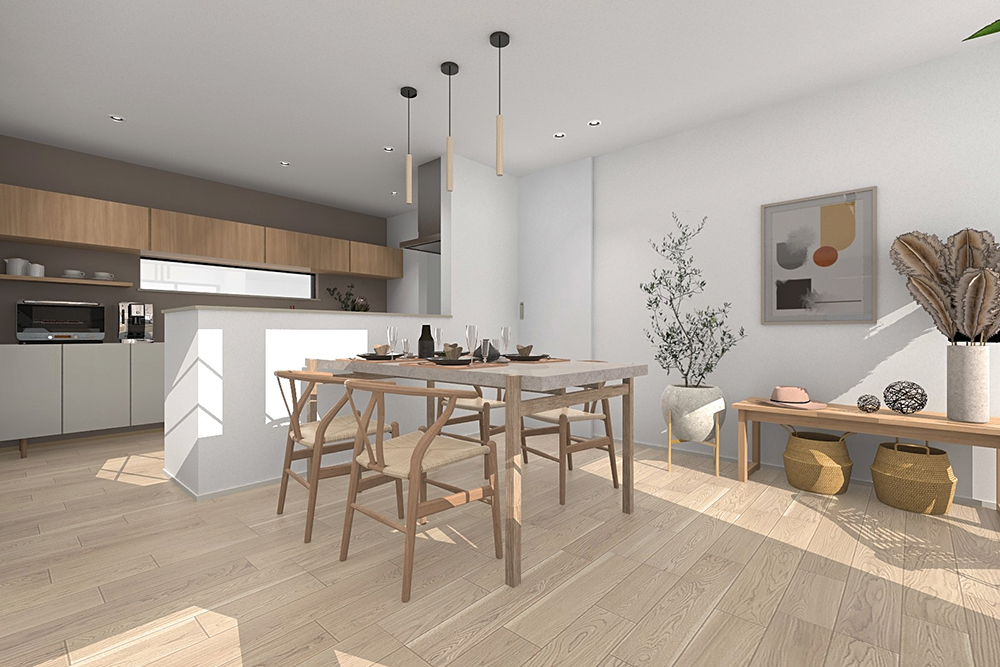 1・2号地は生活シーンをゆるやかに分けるL字型のLDKを採用。キッチンはダイニングと対面しており、賑やかな食卓になります。3・6号地は直線型のLDKになっており、キッチンからリビングの様子を見守りやすい配置。小さなお子様のいるご家庭でも安心です。4・5号地はリビング階段を採用し、家族が自然とひとつの空間に集まりやすくなります。また、全居室に収納があり、整理整頓がしやすい住まいです。7号地は道路より高い位置にLDKを設け、プライバシーの守られた空間を実現。ダイニングの吹抜けは開放感を演出します。8号地は回遊性の高いアイランドキッチンを設計し、快適な家事空間を創出しました。横にダイニングがあるため、配膳もしやすいレイアウトです。9号地は日用品やストック品を片付けやすいパントリーを配置。洗面室と脱衣室を個別に設計しており、朝の支度もスムーズにできます。