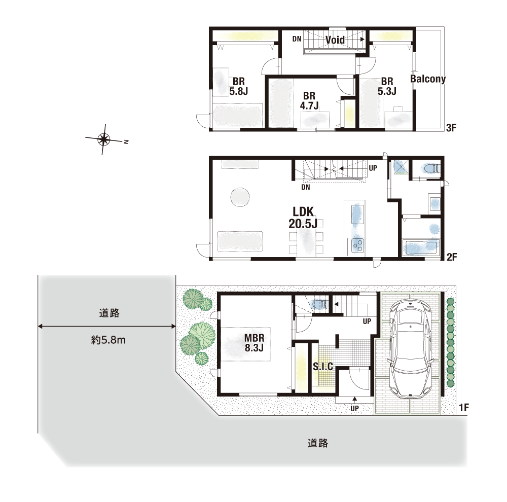 南東角地の開放感を活かし、家族だけの心地よい場所を創出するプランニング。外界からの視線から解放された2階LDKは見通しがよく、家族の様子を見守りやすい空間になります。また、部屋数も多く、お子様が多いご家庭にぴったりです。他にも、ベビーカーやゴルフバッグを収納することができるS.I.Cや大切な愛車を雨風から守るビルドインガレージなど、暮らしやすさに配慮された設計を施しています。
