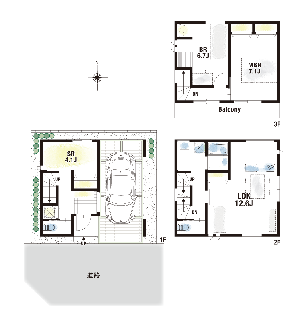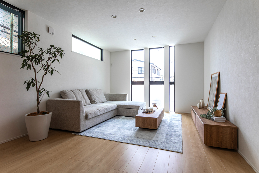 家族が憩うLDKや日々の疲れを癒す寝室を通行人の視線から解放される2階と3階に配置し、コンパクトな敷地にプライベート感のあるプランニングを計画しました。1階は自由な用途でお使いいただけるフリースペースをご用意。暮らしの幅がより広がります。また、3階にはワイドバルコニーがあり、洗濯物が多い日にも大活躍。日用品のストックに便利な廊下収納や雨に濡れない動線を確保したビルドインガレージなど、利便性もしっかり詰め込んでいます。