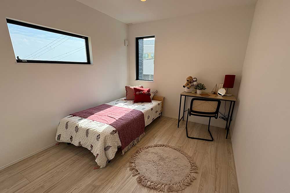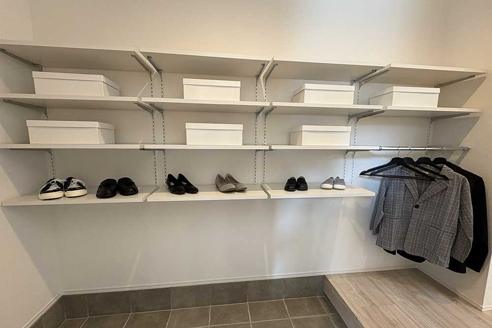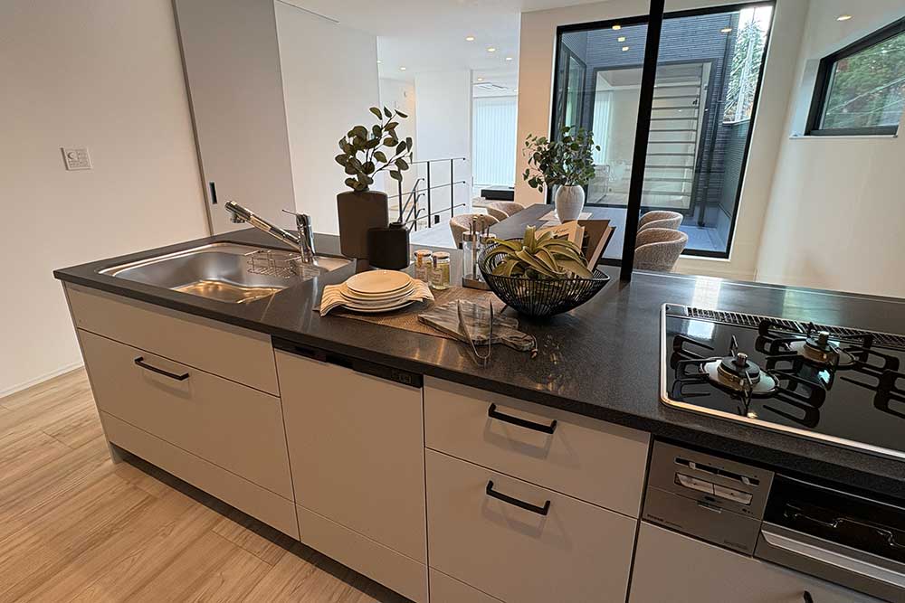 リビングは地上より少し高い場所に配置。吹抜けから柔らかな光が入り込み、明るい住まいへと導きます。LDKは25帖以上の広さを確保することで、開放感溢れる空間へ。ソファで寛いだり、マットを引いて体を動かすなど、ゆったりとした日々を過ごすことができます。また、リビング階段を採用することによって、上下階を移動する際は必ずLDKを通る構造に。自然と家族のコミュニケーションも広がります。W.I.CやS.I.Cといった大容量収納も完備し、綺麗が続く住まいへと導きます。自然と光に心癒される、風通しの良いプランニングをご用意しました。