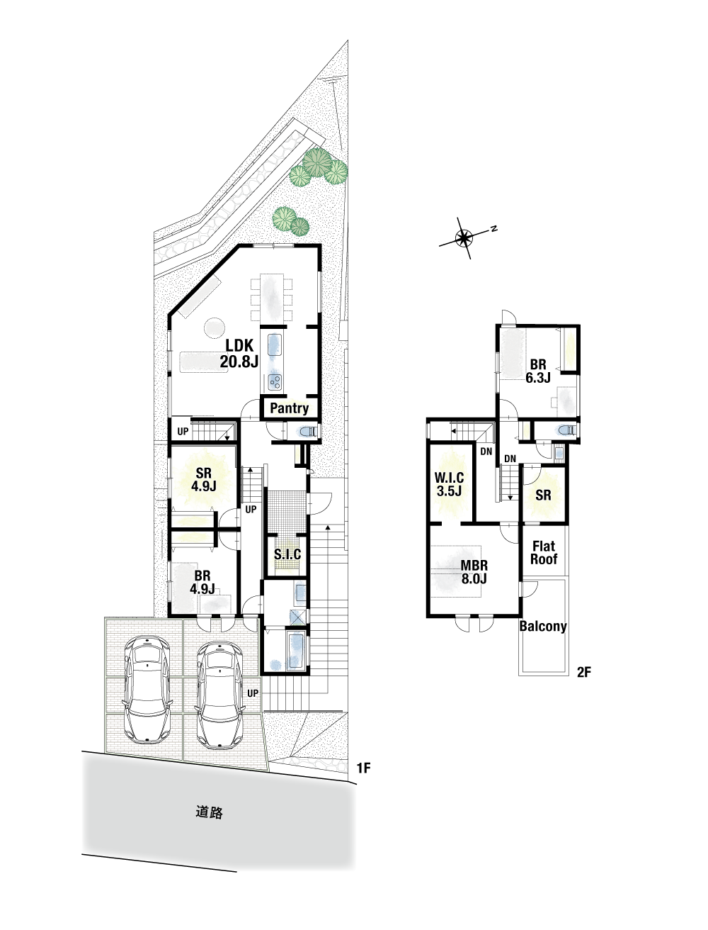 道路より高い位置に建物を建て、外部の視線を感じられにくい安心の敷地計画。スキップフロアを利用したプランニングで空間ごとにメリハリができます。また、両号地とも2台の駐車スペースを確保しました。1号地はリビングダイニングを横並びにし、配膳のしやすい動線を採用。パントリーも隣接しており、備蓄品をスッキリと収納できます。2号地はI型LDKを取り入れ、見通しのよい安心のメイン空間に。水廻りとバルコニーを隣接させているので効率的にお洗濯ができます。