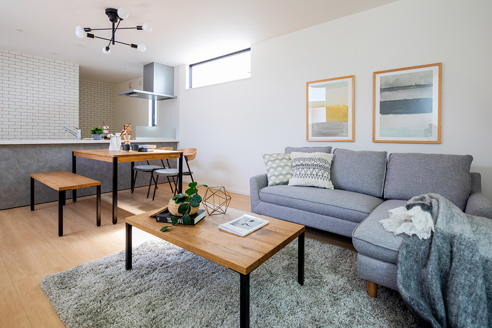 家族が憩うLDKはひと続きで見通しのいい直線型を採用。キッチンはリビングとダイニングを見渡せるように配置しており、料理しながらお子様の様子を見守ることができます。