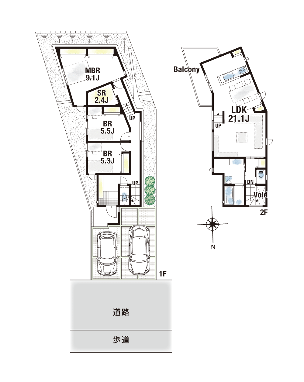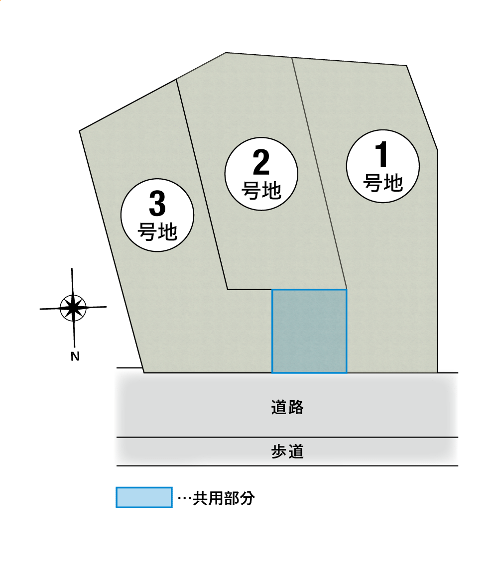 各邸ともにLDKは20帖超えの広々空間。1号地、2号地のLDKにはスキップフロアを採用し、適度に区切りながらも空間を心地良く繋ぐ設計に仕上げました。