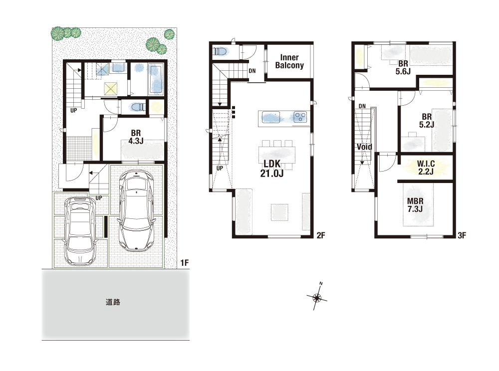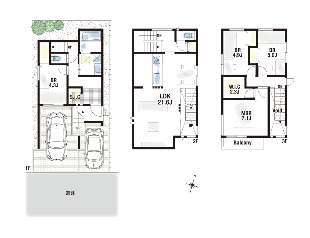 両邸ともにプライバシーが守られた2階LDKを有するくつろぎの住まい。見通しの良い一体型レイアウトと吹抜けを採用しているため、開放的な空間になります。また、居室を4部屋用意しており、家族一人ひとりが部屋を持つことも可能です。収納面では1・2号地の主寝室にW.I.C、2号地の玄関横にS.I.Cをそれぞれご用意。さらに、駐車スペースはビルトインガレージになっており、雨に濡れることなく乗り降りや荷物の積み下ろしができる設計です。