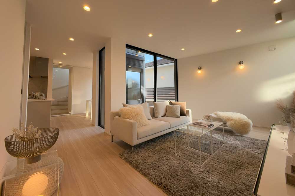 約28.4帖の広々としたLDKには、ロフトやヌックなどプライベート感のあるスペースを配置しました。開放感あふれる空間で家族団欒のひとときを過ごしたり、程よいくつろぎ空間で読書や趣味を楽しんだりと暮らしの幅が広がります。さらに、2ヶ所のルーフバルコニーを完備しており、青空を感じながら快適に過ごすことができるように設計しました。