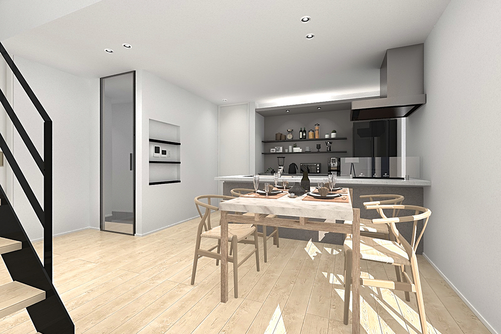 約25帖の開放的なLDKにはリビング階段を配置。2階寝室への移動やお出かけの際に必ずLDKを経由するようになっており、自然と家族がひとつの空間に集まりやすい動線を確保しました。リビングには小さな憩いスペースであるヌックを設計し、家族のくつろぎ時間を豊かにします。