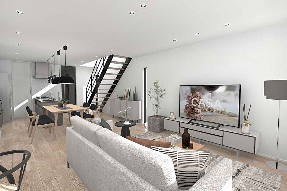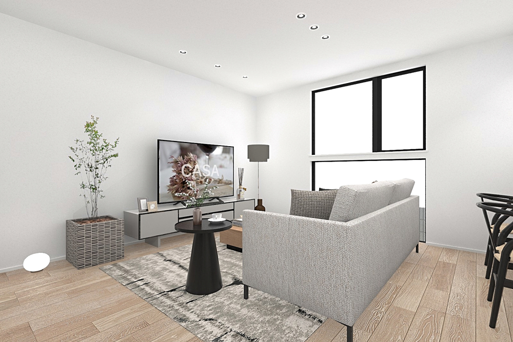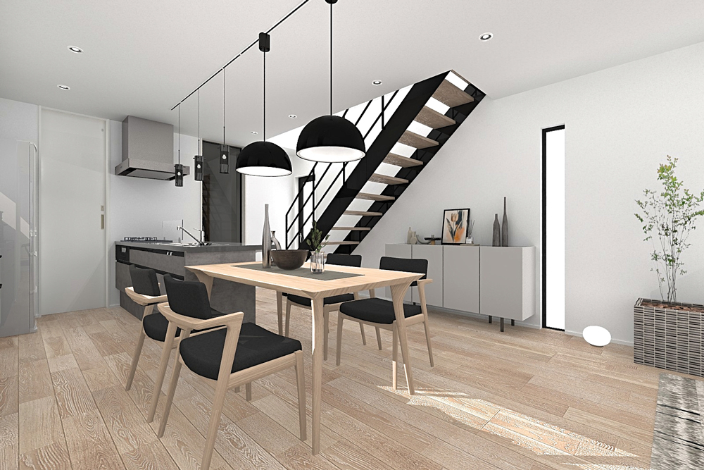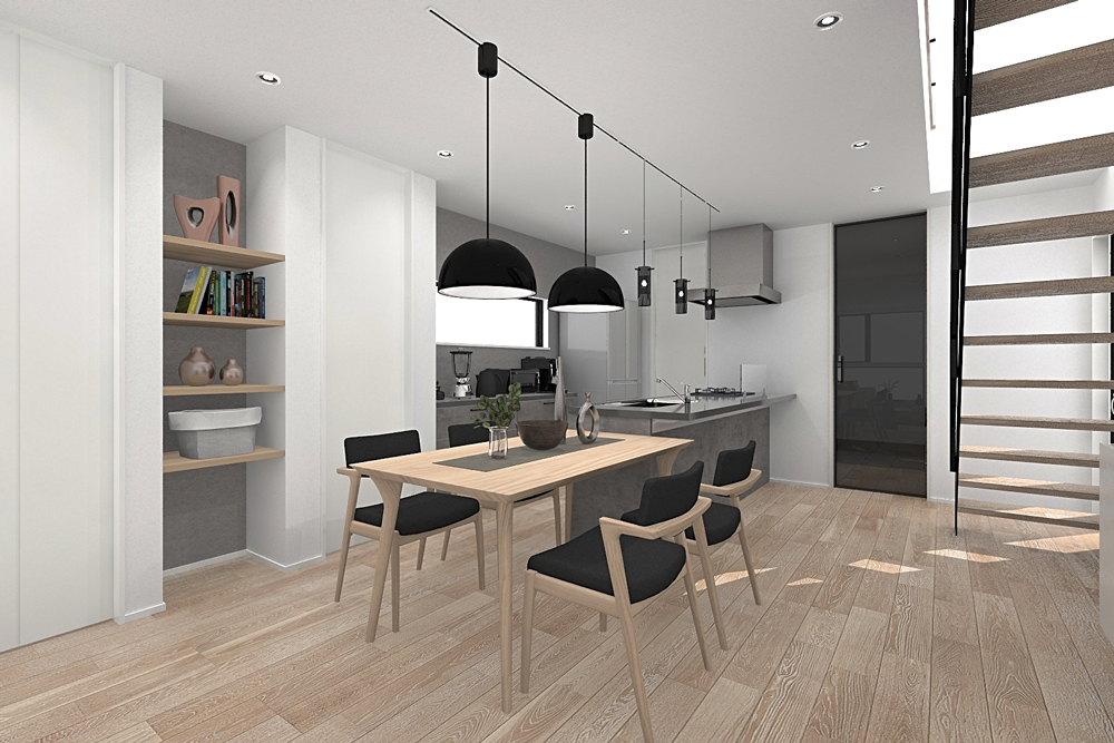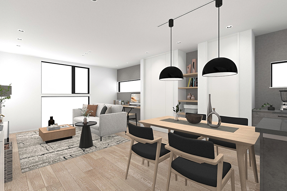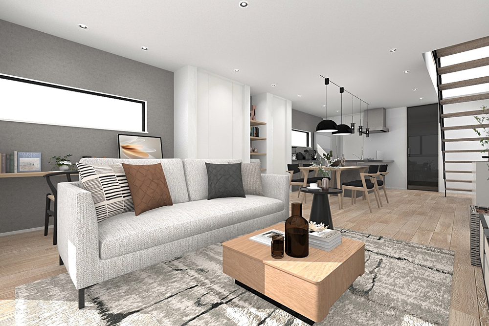 メイン空間は見通しのいいI型LDKを採用。料理をしながら家族を見守ることができる安心の設計です。また、玄関とパントリーを直通させることで、沢山買い物した日も楽に荷物を運び込める動線を確保しました。さらに、リビングにはカウンターを設置。リモートワークやお子様の宿題などに最適なスペースです。