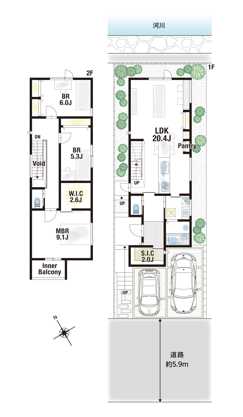 2階には約9.1帖の広々とした主寝室をご用意。大容量のW.I.Cも付いており、お部屋をすっきりと綺麗に保つことができます。他にも玄関には約2帖のS.I.Cを配置しました。靴だけでなくベビーカーなども楽々収納できるのが便利なポイント。