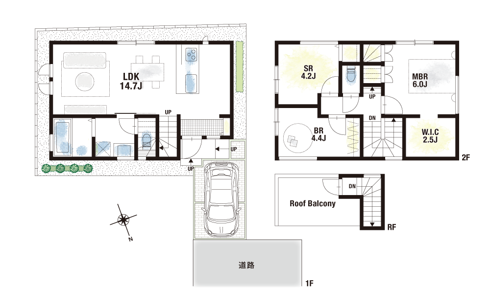 プライバシー性のある立地に家族だけの空間を創るプランニング。LDKは見通しの良い直線型を採用し、開放感が生まれます。また、リビング階段を配置しており、家族が自然とLDKに集まってくる動線を作りました。2階に設けられた主寝室。衣類をたくさん収納できるW.I.Cが設けられており、整理整頓が捗ります。そして、屋上には陽光に包まれるルーフバルコニーをご用意。高台になっているため、眺望も良好です。