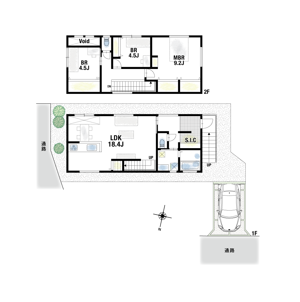 1号地はLDKを2階に設計。道路からの視線が気にならない、のびのびと暮らせるメイン空間です。2号地は洗面室の勝手口からフラットに外へ繋がる効率的な動線になっており、洗濯物をスムーズに干すことができます。3号地は1階に見通しのいい直線型LDKを配置。小さなお子様を見守りやすく、家族想いな設計です。4号地は2階LDKから自然光が差し込む明るい住まい。通行人の視線も気にならず、家族だけの時間を過ごすことができます。5号地はダイニングに吹抜けを設け、賑やかな食卓を演出。毎日の食事も楽しいひとときになります。そして、全邸ともに便利なS.I.Cをご用意。荷物が多いご家庭でも整理整頓が行き届きます。