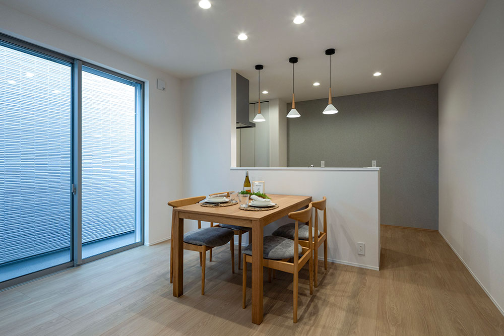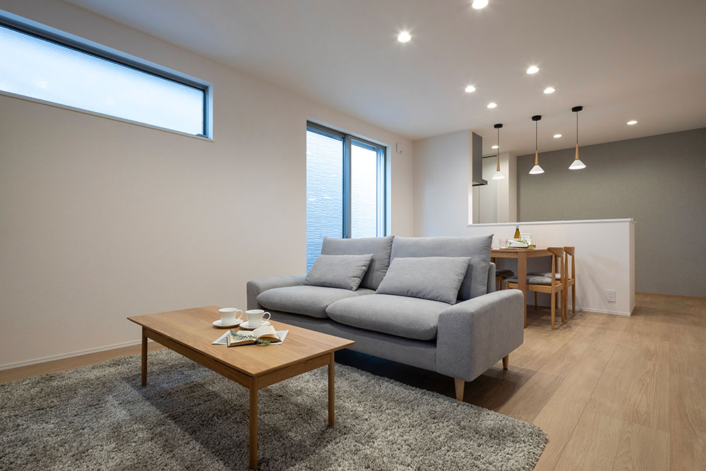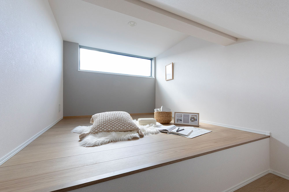家族の様子を見守れる見通しのいいLDK。水廻りを隣接させることで、料理をしながら洗濯をしたり、入浴中の家族の様子を見守れるレイアウトです。また、リビング階段を設けることで、より家族の気配を感じられるメイン空間に。2階の寝室にはロフトを配し、物置スペースや趣味部屋などフレキシブルに活用できるスペースを確保しました。ロフトには窓を設けているので、閉塞感なく、個室としても過ごすことが可能です。