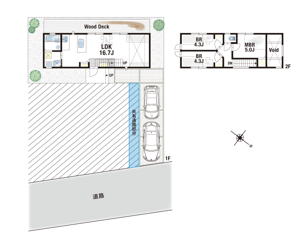 1号地は2つの寝室を大胆に繋ぐウッドデッキを設計。外空間を活用した回遊動線となるだけでなく、広々としたスペースで自由気ままにくつろぐことができます。