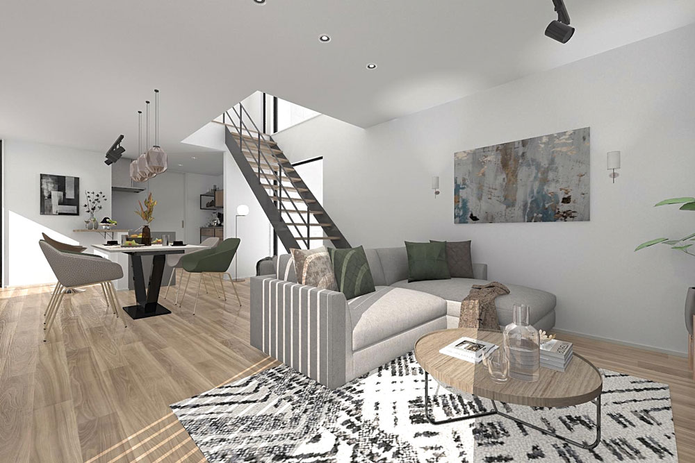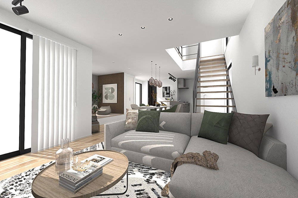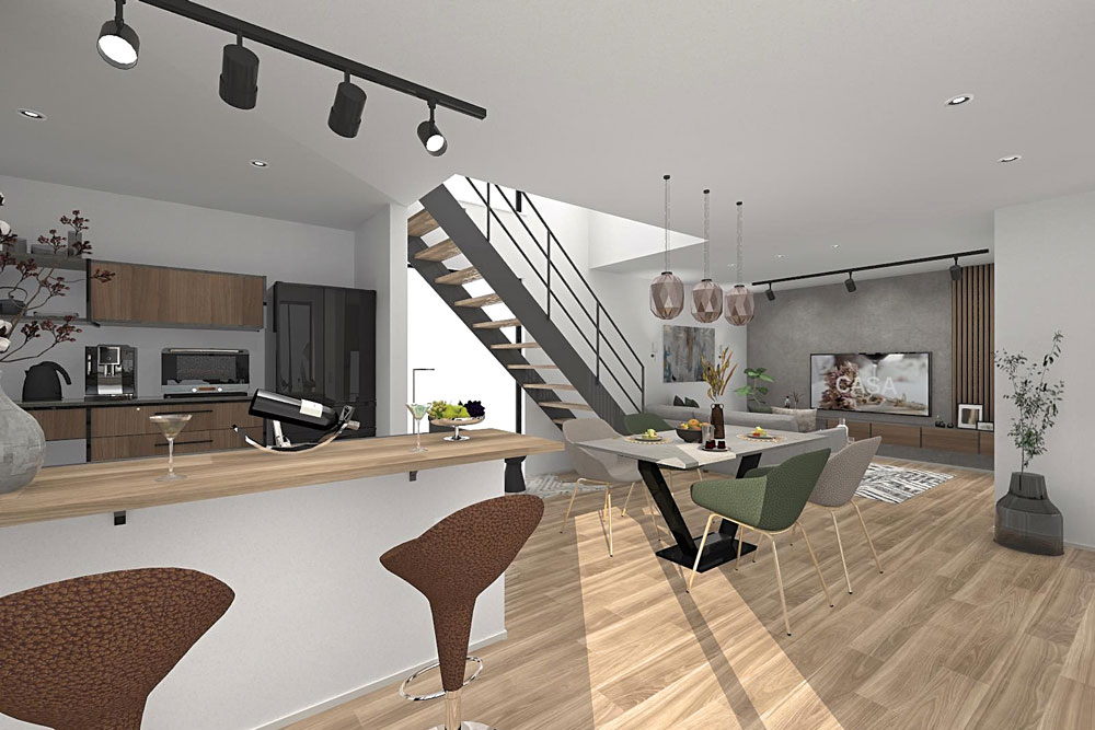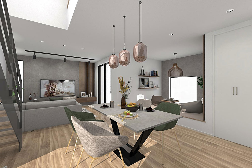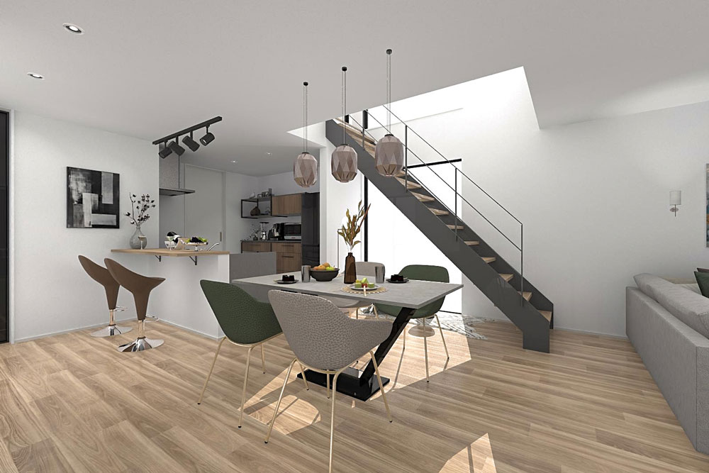 両邸ともに20帖以上の広さを持つ広々としたLDKを確保。上部に吹抜けのあるリビング階段を設け、日々家族と顔を合わせる機会を自然と増やしてくれます。LDKの一部にタタミコーナーを配しており、客間や寛ぎスペースとして活用できます。また、玄関にはウォークスルー型のS.I.Cと洗面台を設け、帰宅後すぐに手洗いや身支度ができる動線に。玄関まわりをすっきり保ちながら、清潔な状態で室内に入ることができるため、毎日の暮らしがより快適になります。