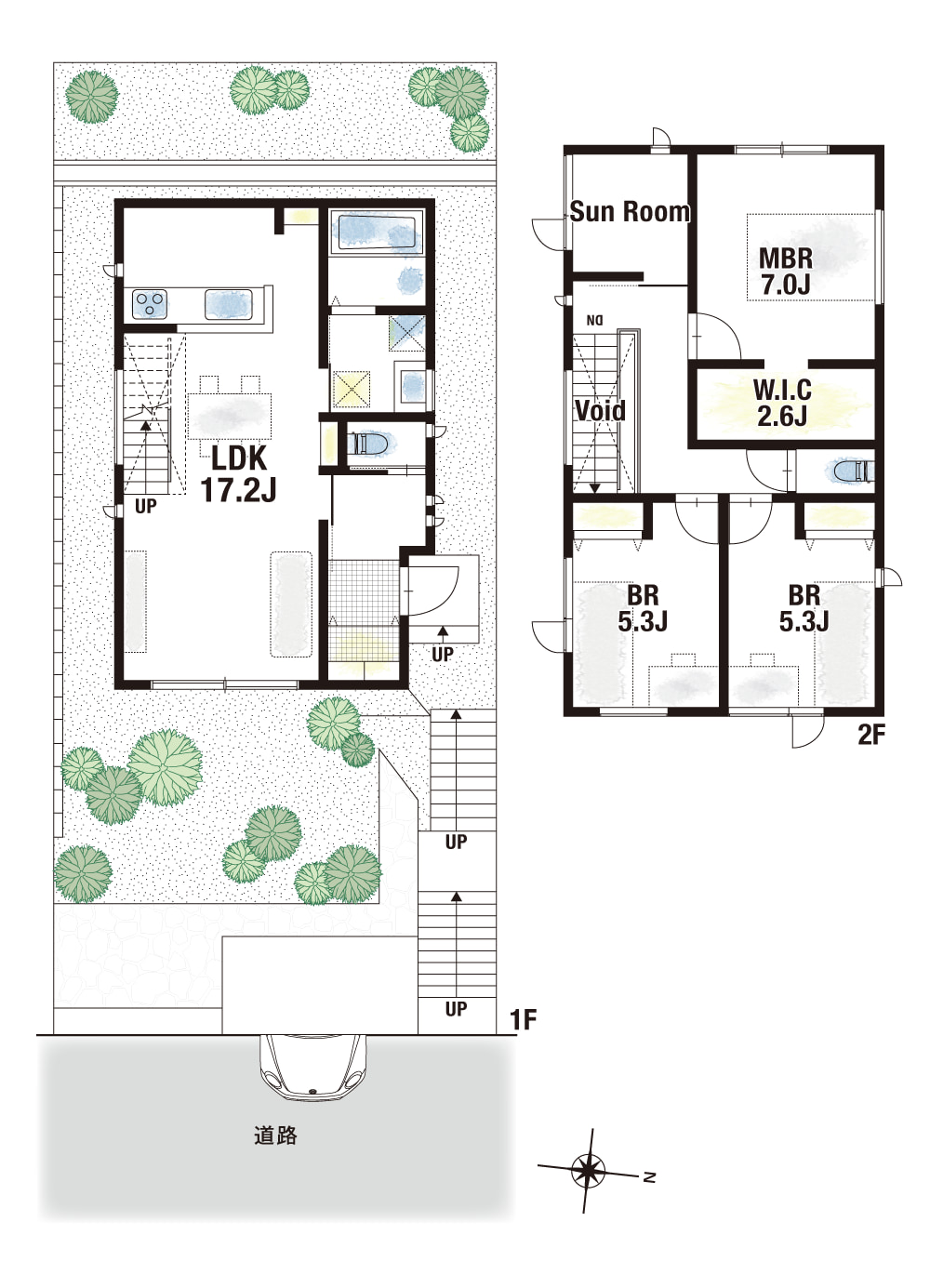 2号地はLDKの一角をフロアタイルに。空間を緩やかに仕切り、メリハリのある空間を演出します。さらに、リビングに隣接した庭もご用意。家庭菜園やDIYなど、さまざまな用途で活用できます。