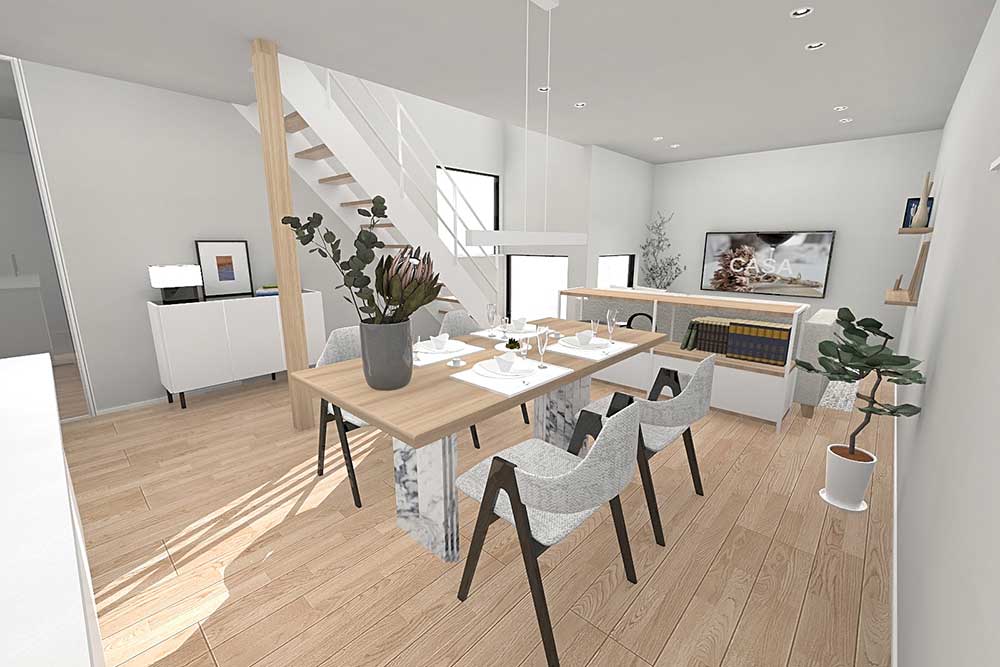 1号地のLDKは直線型を採用。ひと続きで見通しが良く、小さなお子様のいる方も安心です。また、2階には日差しをたっぷりと取り込むサンルームを設計。天気を気にせず洗濯物を干せるだけでなく、趣味やくつろぎの場としても活用できます。