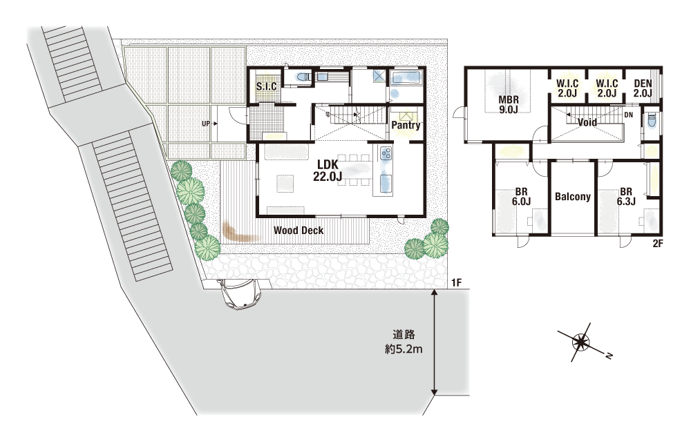約22帖のLDKに隣接するL型のウッドデッキ。美しい風景を愉しむだけでなく、室内に優しい陽光と涼風を取り込んでくれます。玄関先には多用途でお使いいただけるマルチスペースをご用意。お子様の遊び場やガーデニングなど暮らしの幅が広がります。他にも、豊富な収納スペースや大切な愛車を守る掘り込み車庫など生活が軽やかになる要素を随所に設けました。