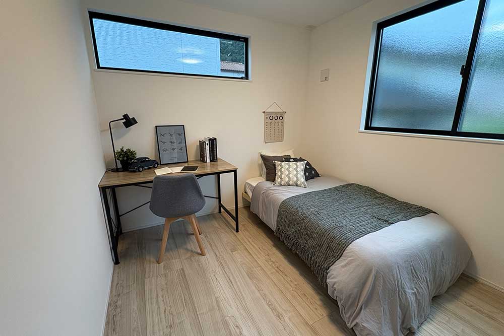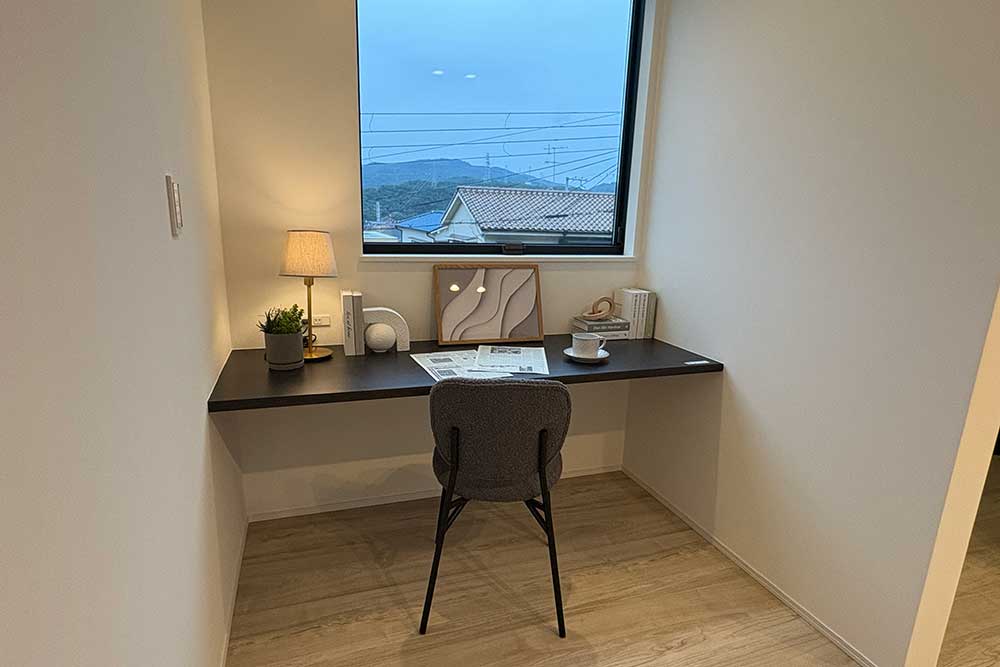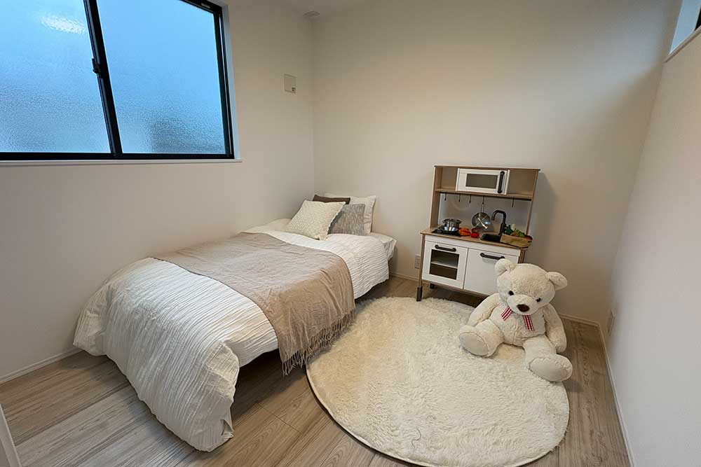 一直線で見通しのよい広々としたLDK。ウッドデッキが隣接され、室内外どちらでもご家族とのんびり過ごせるプランニングになっています。水廻りは玄関と直接繋がっており、外出時の身支度や、帰宅時の手洗い・入浴がしやすい動線に。また、2階には3室のプライベートルームを用意しました。さらに、南に面した陽当りのよいバルコニーが階段のそばにあり、洗濯以外に日向ぼっこなどができる快適な屋外空間になっています。
