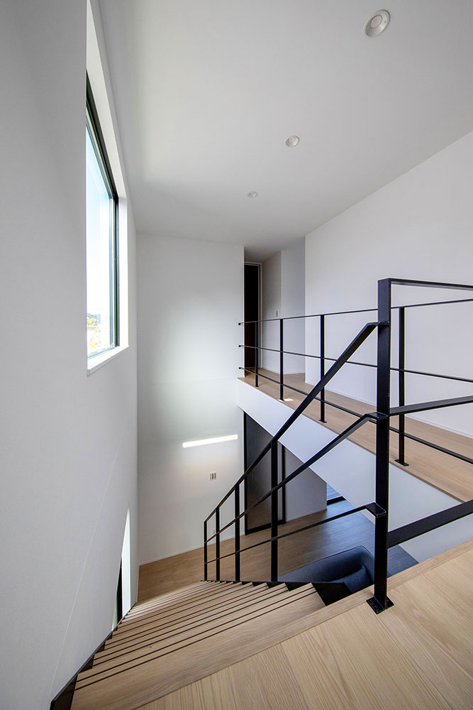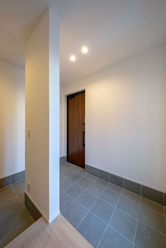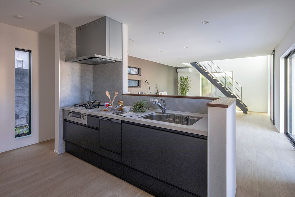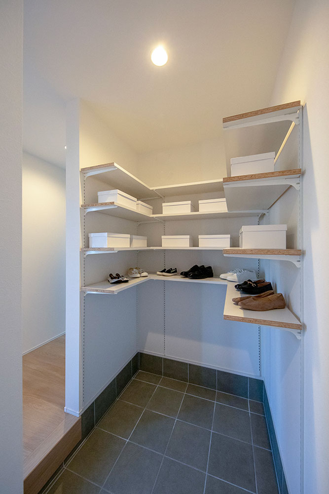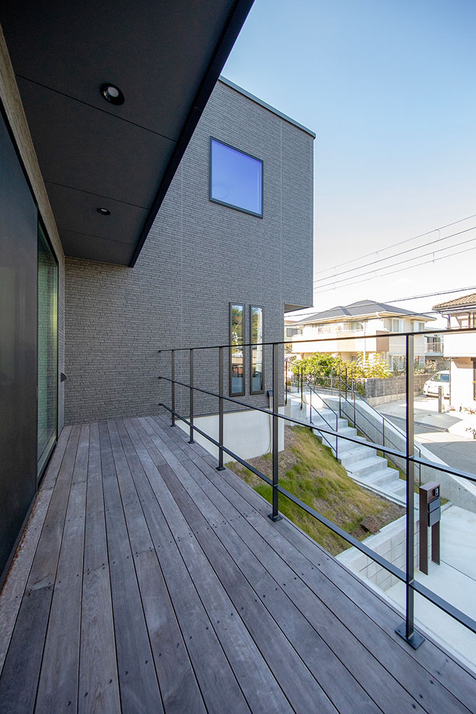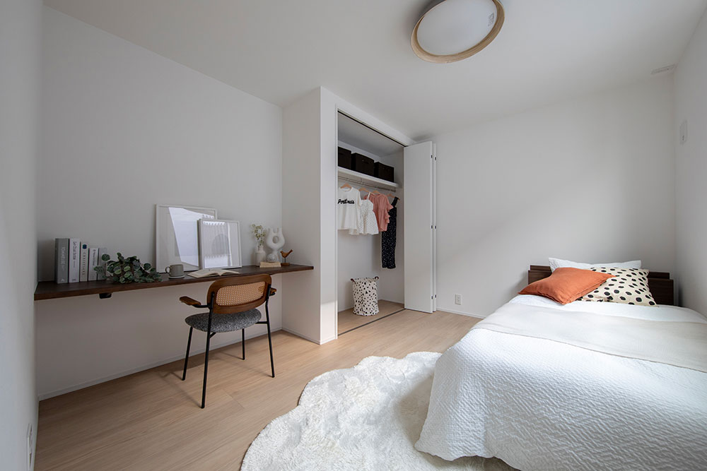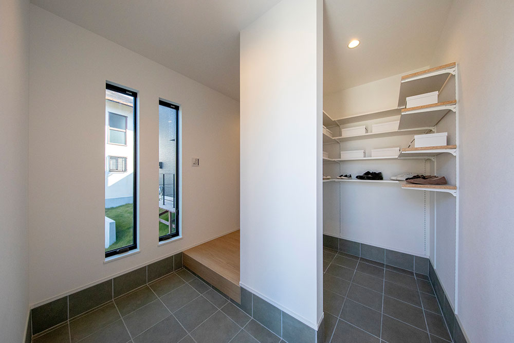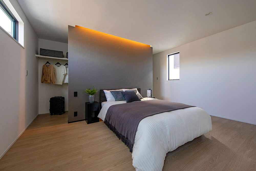 25帖のLDKは収納や造作カウンターを設けており、デスクワークができるなど一日中快適に過ごせる空間に。ウッドデッキを隣接しているので、外の空気を感じながらゆったりと過ごせるように配慮しています。玄関は土間の間口を広くし、複数人でのお出かけもしやすいゆとりのある広さです。さらに回遊式のS.I.Cを設置することで、すっきりとした玄関廻りに仕上げました。2階の主寝室にはベットの両横から入れるW.I.Cを完備。2人でも利用しやすく、すっきりとした寝室を保てます。