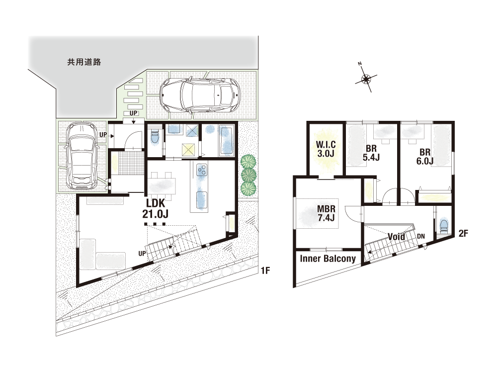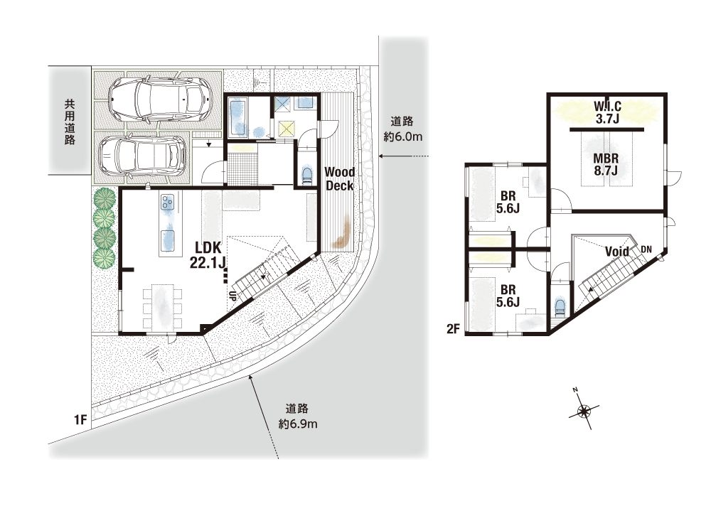 2号地は主寝室にインナーバルコニーとW.I.Cを設計。雨の日でも洗濯物を干すことが可能になり、片付けもスムーズに行うことができます。3号地は洗面室と隣接したウッドデッキをご用意。高台を活かした豊かな眺望を愉しむことができ、暮らしに癒しをもたらしてくれます。