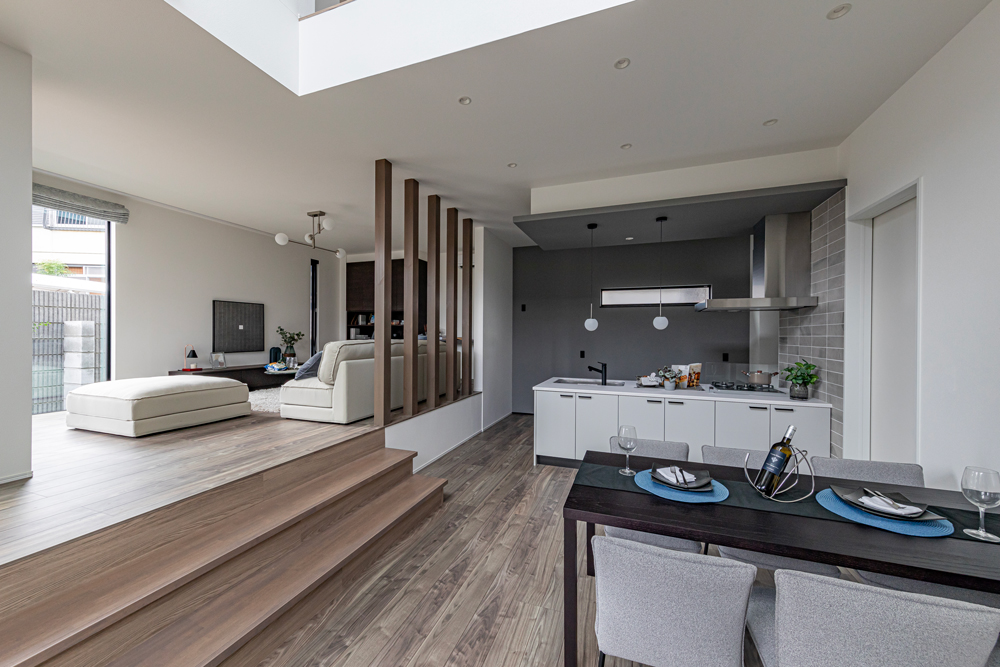 南北二方向が道路と接しており、開放的な立地に恵まれた邸宅。LDKに取り入れたスキップフロアは、食事の場と寛ぎの場を緩やかに分けながら連続性のある空間を創出。吹抜けを組み合わせることで、たっぷりと陽光が降り注ぐ気持ちよい場所に仕上げました。さらに、天候・時間を問わず外の空気を感じられる屋根付きのウッドデッキが隣接しています。
