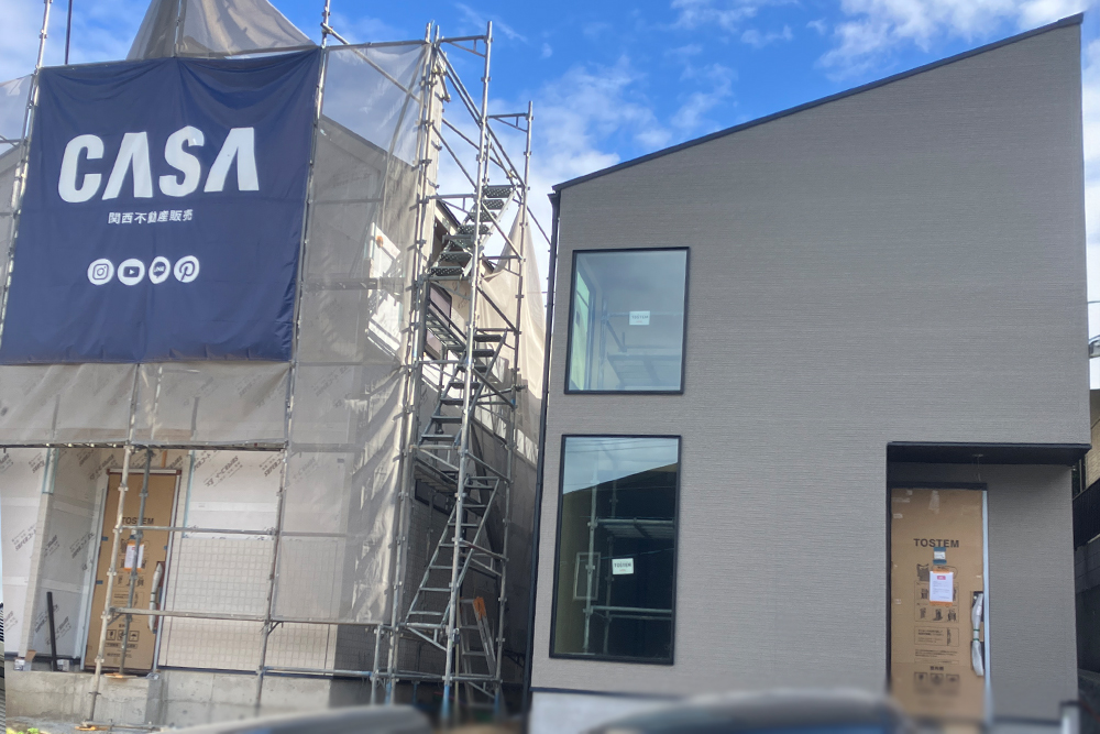 両号地ともに住まいを前面道路より高い位置に建てることで、プライバシーを確保した寛ぎ空間を実現しました。1号地は約25帖の大空間LDKが特徴。リビングの吹抜け階段がより開放的な印象を与えます。2階のユーティリティスペースは家族のライフスタイルに合わせて多用途に活用できます。2号地は22.8帖のLDKを設計。リビング上部の吹抜けから光を採り入れることで、明るく開放感のある憩いの場を創出します。またリビングを見渡せる対面式のキッチンは、家事をしながらお子様の様子を見守れる安心の設計です。その他パントリーやW.I.Cに加え、玄関に大容量の収納スペースを設け、各邸余裕のある収納を叶えました。