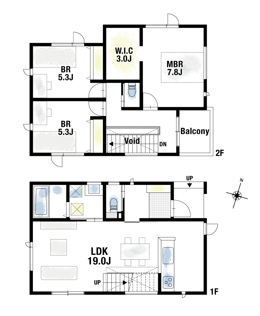 両邸ともにリビング階段を設けた間取り設計を採用。出入りのたびに自然とリビングを通る動線になり、日常の中で家族のふれあいを育みます。1号地は南側の開口からたっぷり陽光が差し込み、明るいひだまり空間を演出。さらに、主寝室には大容量のW.I.Cを完備し、衣類だけでなく季節用品や趣味のアイテムをすっきりと収納することができます。
