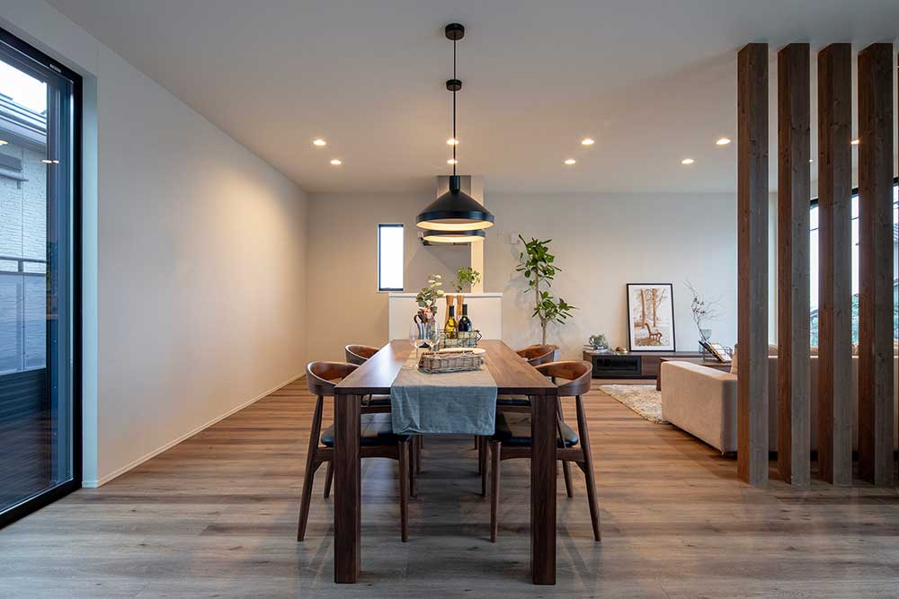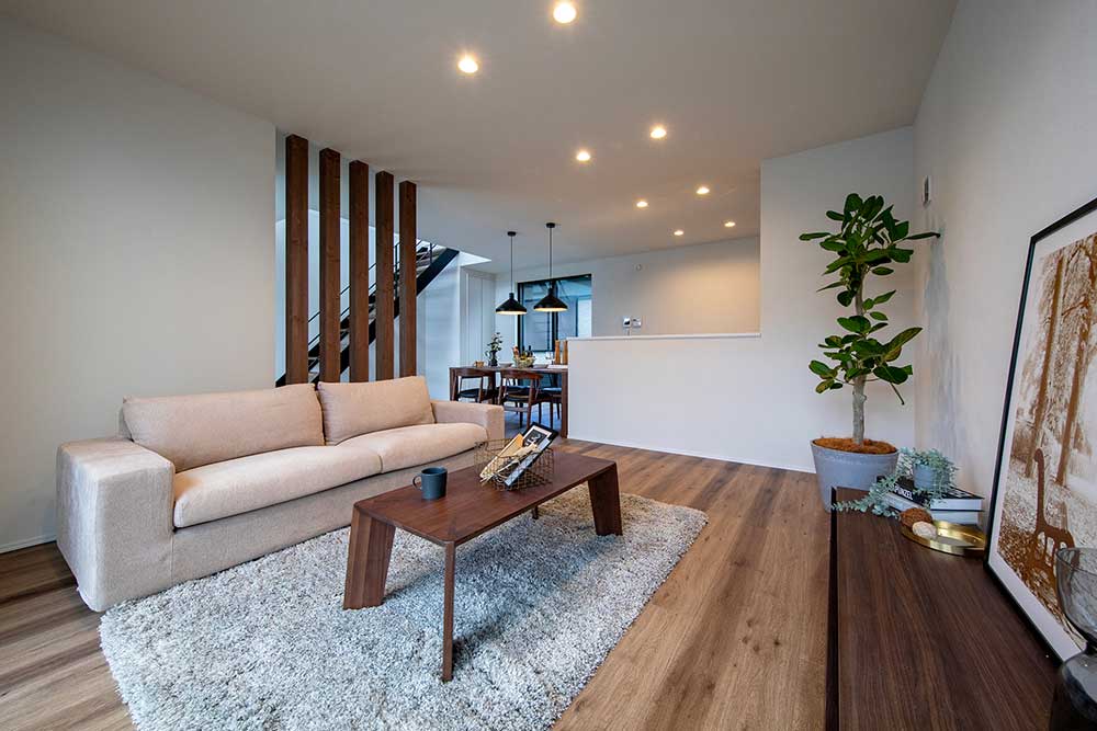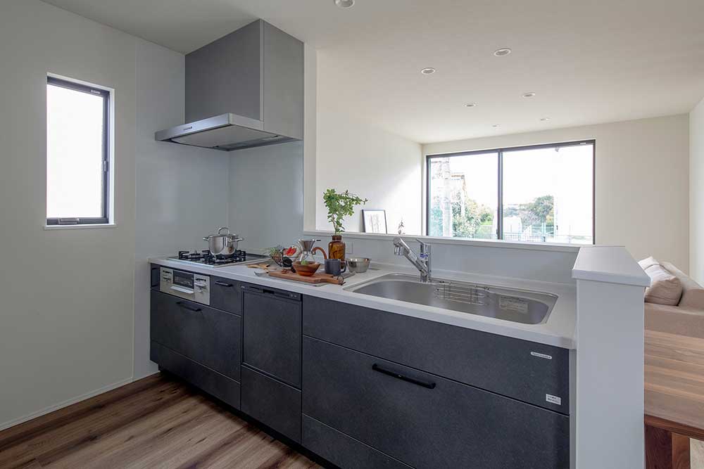 暮らしの集い場となるLDKにはL字型を採用し、リビングに居るお子様とコミュニケーションをとりながら料理をすることが可能。生活導線も短縮され、食事の配膳がしやすく、家族みんなの笑顔が広がり利便性抜群な空間です。