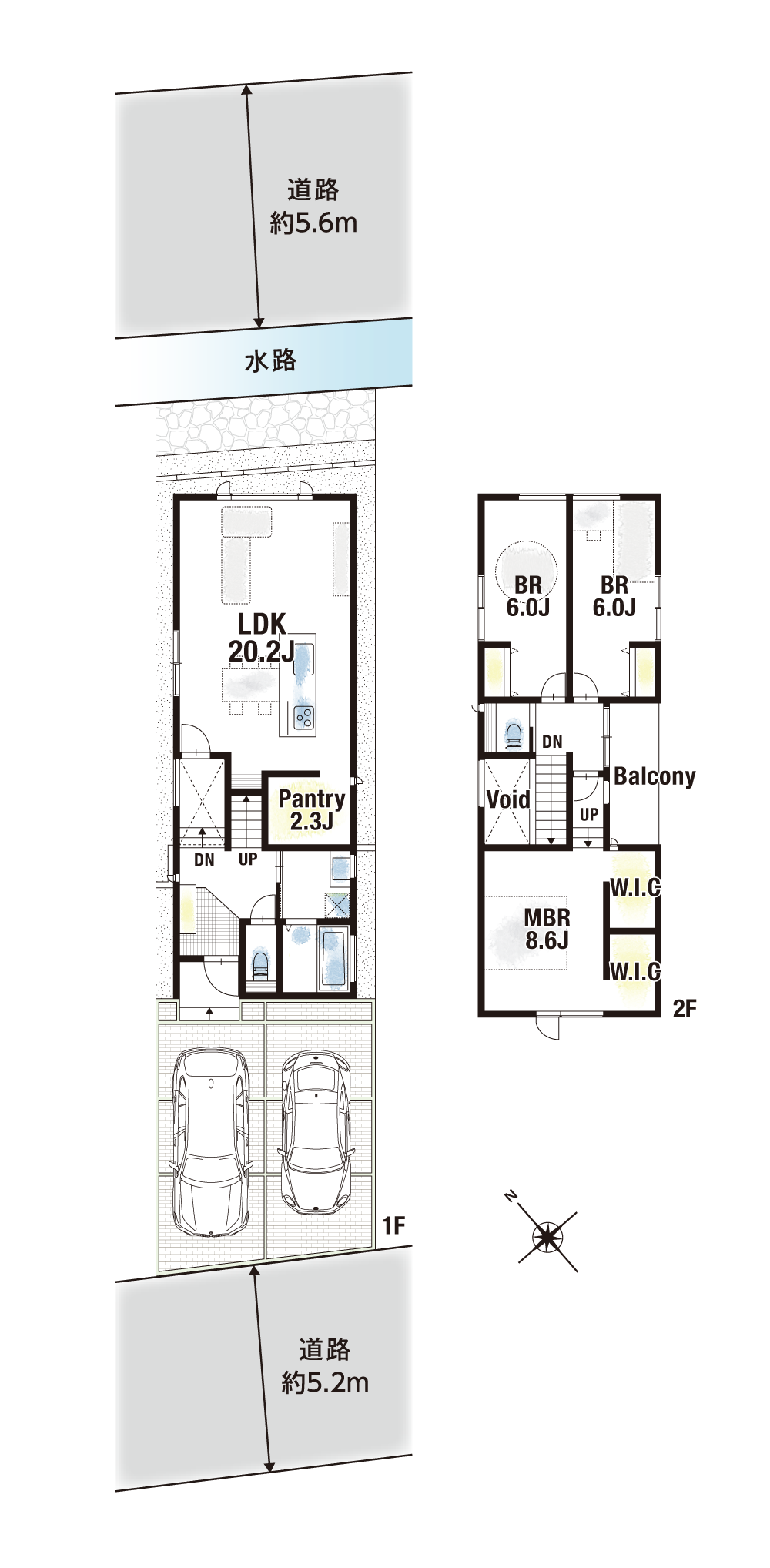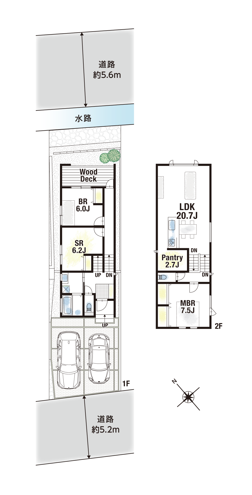 1号地は寝室横に開放的なウッドデッキをご用意。家族の憩い場として心置きなく寛いだり、洗濯物を干したりするのに便利です。2号地は複数人での調理がしやすいアイランドキッチンを採用。ご家族のコミュニケーションも広がり、毎日の食卓が賑やかになります。