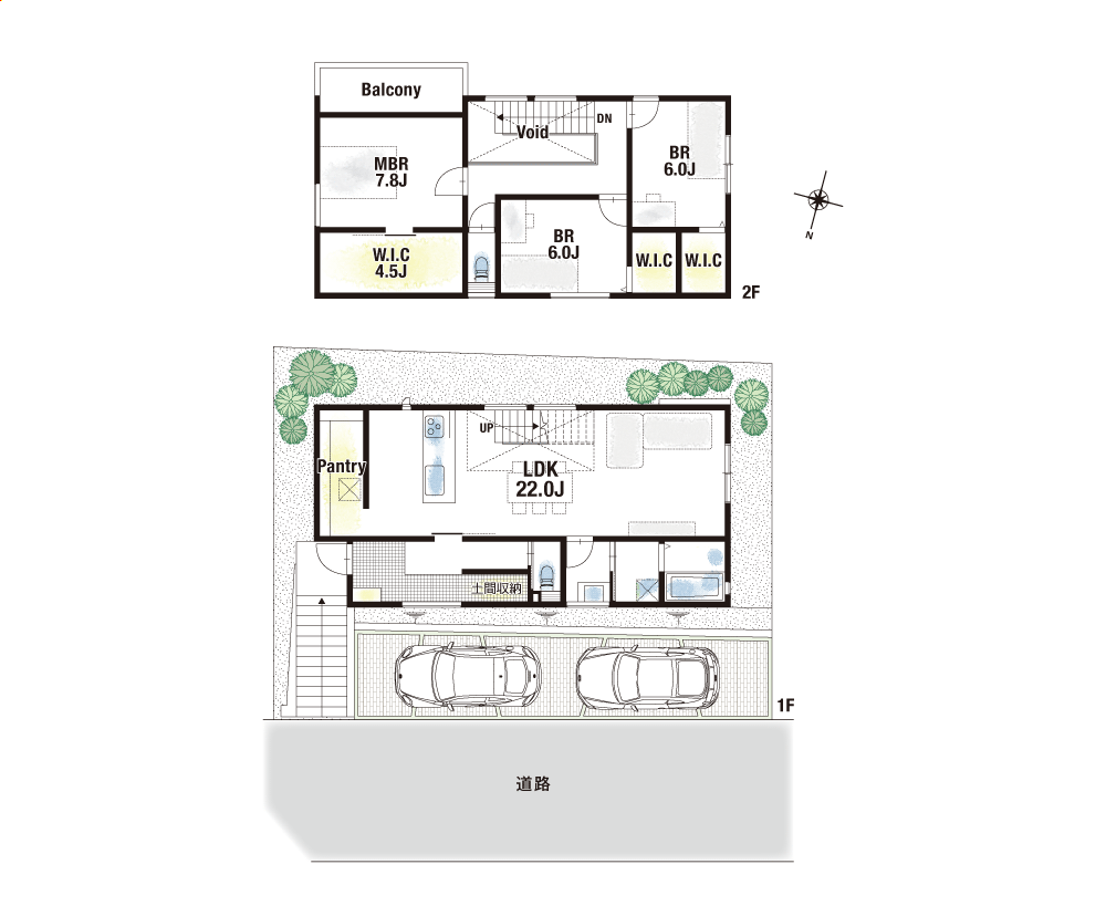 両邸ともに、吹き抜けを設けた20帖超のLDK。明るさと開放感に包まれ、家族が自然と集う心地よい空間です。さらに、全居室に大容量のウォークインクローゼットを完備。収納計画に配慮し、住まい全体をすっきりと保てる機能性を兼ね備えています。1号地は、広々と料理が楽しめるペニンシュラキッチンを採用。お料理中も家族の様子がわかる安心設計です。2号地は、冷蔵庫も収まるパントリーを併設。ストック品などもまとめて収納でき、生活感を抑えた美しい空間を保てます。また、両邸共通で洗面室と脱衣室を分けることで、家族それぞれが気兼ねなく使える忙しい日常にも配慮した動線を叶えました。