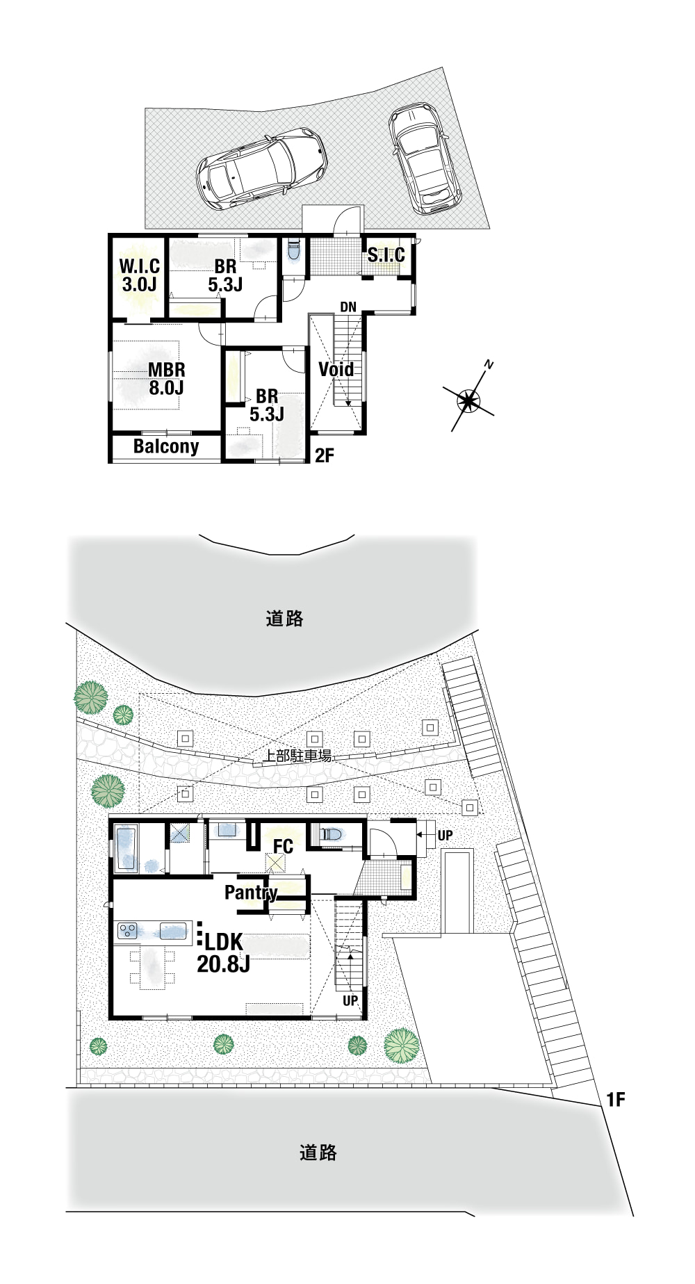 陽当たり良好で見晴らしの良い高台に建つ邸宅。住まいの二方が接道し、南側には掘り込み式車庫、北側には鉄骨架台駐車場を設けました。南北2箇所に玄関を設けることで状況に応じて使い分けられる設計です。20帖以上の広々としたLDKは、吹抜け階段と回遊動線を採用することで更に開放的な空間になります。2階の主寝室には南向きのバルコニーを設け、光と風を取り込みます。また、住まいの各所に適材適所の収納を確保。W.I.Cやパントリー、S.I.Cに加え、玄関近くには便利なファミリークローゼットを完備しています。