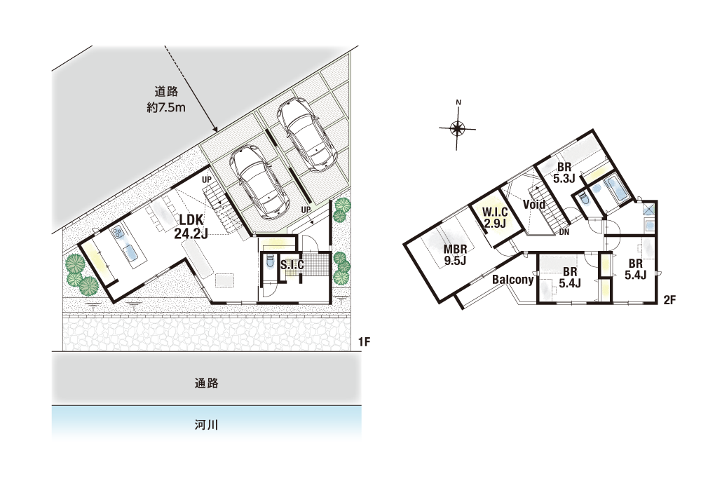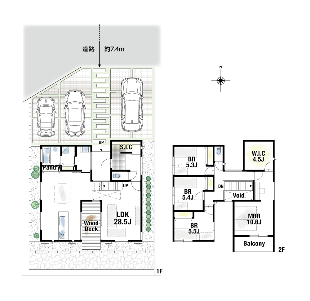 1号地は大きな吹き抜けとリビング階段のある24.2帖のLDKを設け、家族みんなが自然と集まりたくなる空間を創出。テレビを見たり食事を楽しんだりと家族のひと時がより豊かになります。2号地はウッドデッキを囲んだコの字型の間取りを採用。家に居ながら外の心地よさも感じられる、のびやかな開放空間になりました。さらに、南側に窓を配置することで、室内全体が自然光に満たされます。寝室は両邸ともに4部屋をご用意。家族それぞれのプライベート空間や趣味の場、ゲストルームとしても利用できます。主寝室には収納力たっぷりのW.I.Cも備えています。駐車場もゆとりのある広さを確保しており、自転車やバイクの駐輪場としても活用可能です。