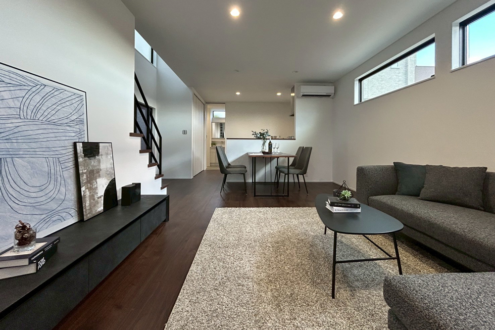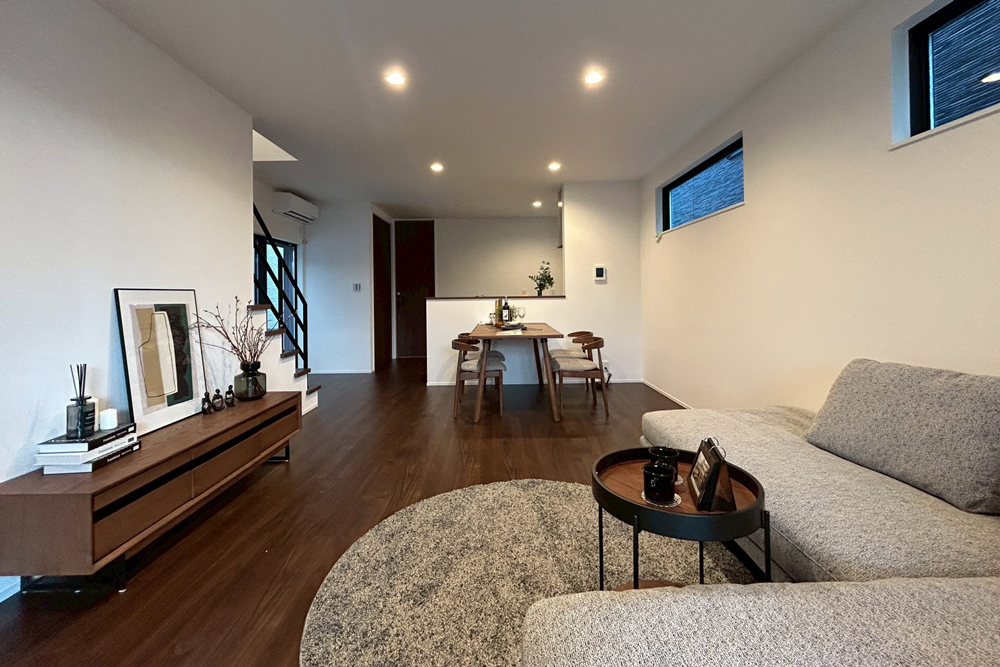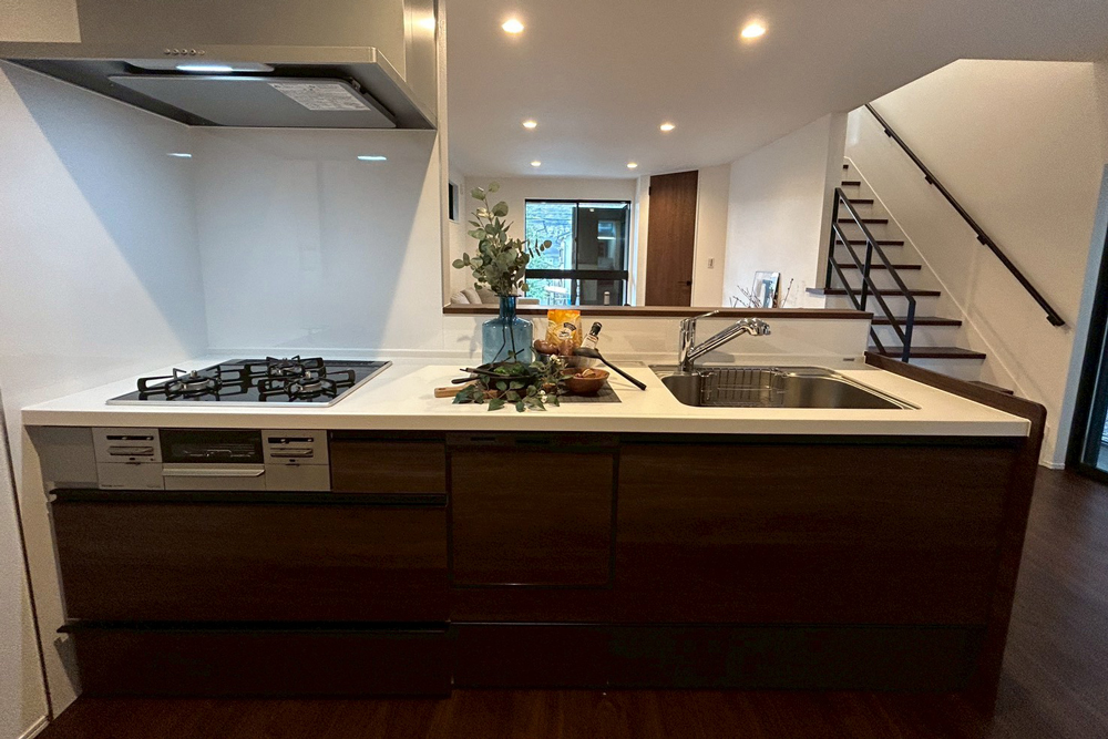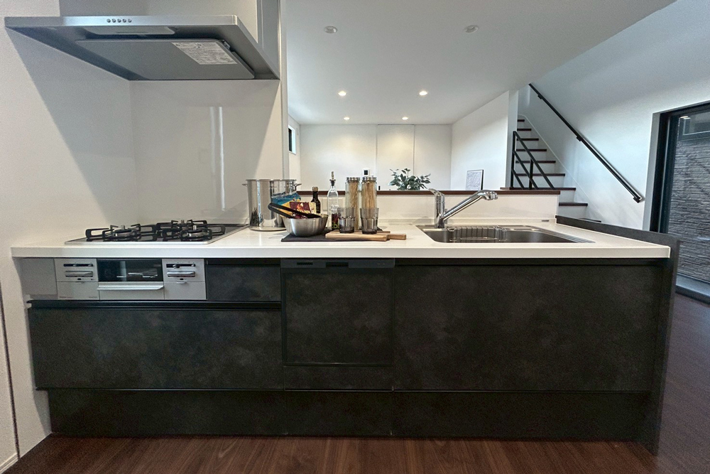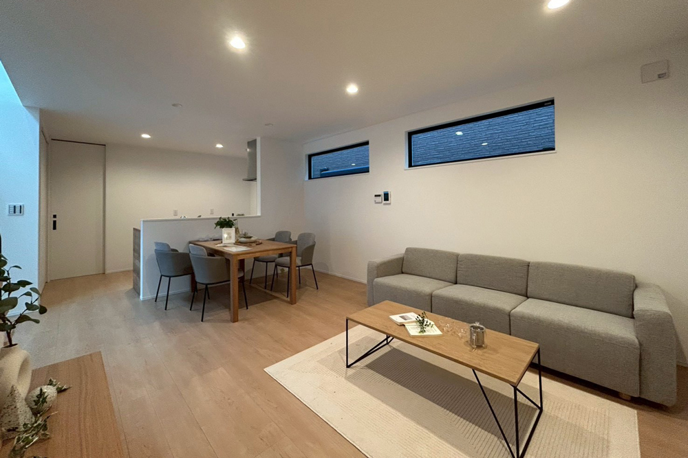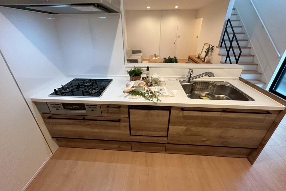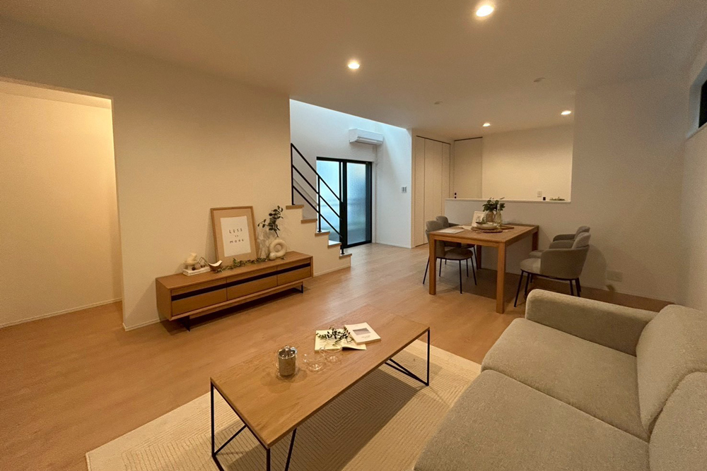全邸、直線型を採用したLDK。部屋全体を見渡しやすく、料理中もリビングにいるお子様を見守ることが可能です。また、リビング階段を配置することで、フロアを移動する際に必ずLDKを通る設計に。顔を合わせる機会が増えて、コミュニケーションも広がります。