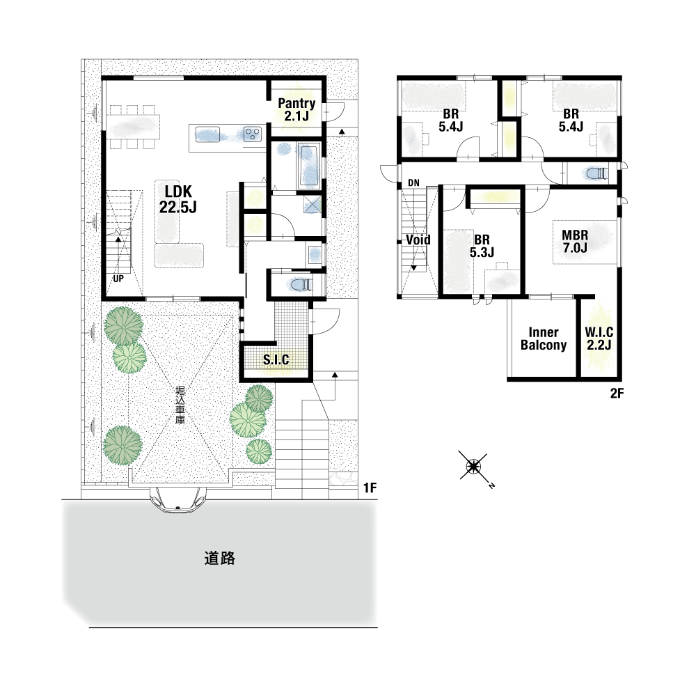 約22.5帖のLDKは、空間全体に視線が抜ける見通しの良いプランニング。リビング階段を設けることで、家族が自然と顔を合わせる動線を確保し、いつでも気配を感じられます。キッチン横には約2.1帖のパントリーを備え、食材や調理器具をまとめて収納可能。キッチンもゆとりを持って使うことができ、日々の料理時間を快適に支えます。2階には4つの居室を配置し、それぞれに収納を完備。主寝室には夫婦の衣類をたっぷり収められるW.I.Cを設け、暮らしにゆとりと機能性をもたらします。さらに玄関には、靴だけでなくベビーカーなども収納できるS.I.Cを配し、散らかりがちな玄関周りもすっきりと整います。