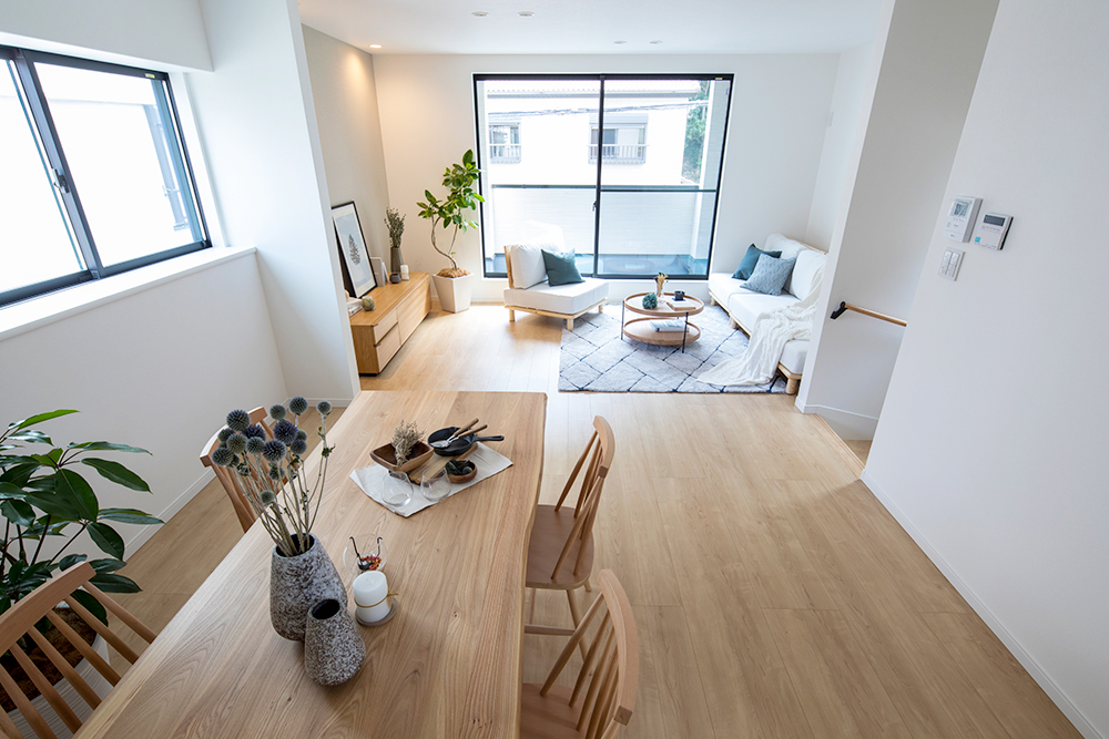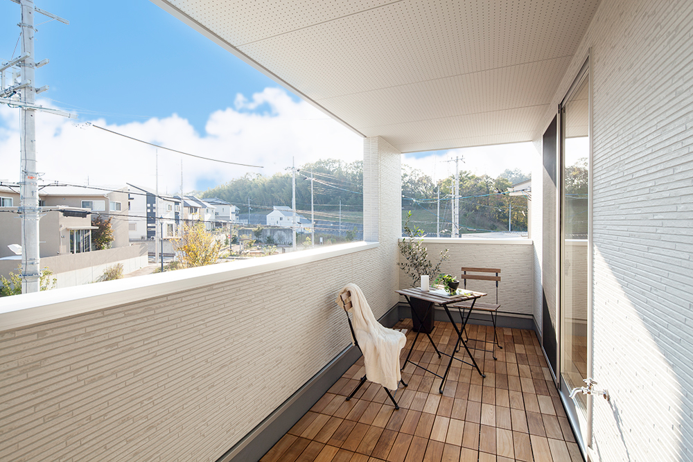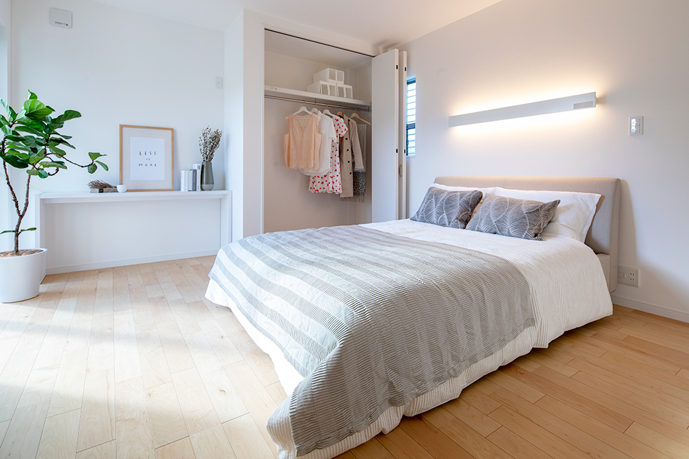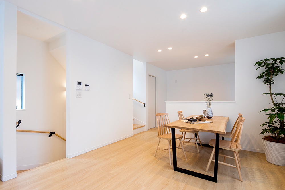 LDKは2階に配置し、プライベート性を確保した設計。直線型を採用しているため、調理中でも家族の様子を見渡すことができ、安心して過ごせます。また階段の上り下りの際には必ずLDKを通過するため、家族が自然と顔を合わせ、日常の中で会話が広がります。全室にクローゼットを備え、さらにパントリーやS.I.Cを設置。適材適所に収納スペースを設けることで、物が散らかりにくく、すっきりと整った暮らしを実現します。家族のつながりを大切にしながら、日々の暮らしを快適にする工夫を随所に盛り込んだ住まいです。