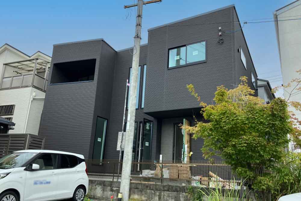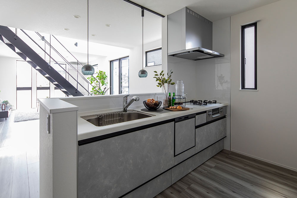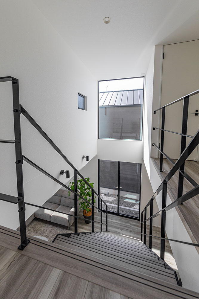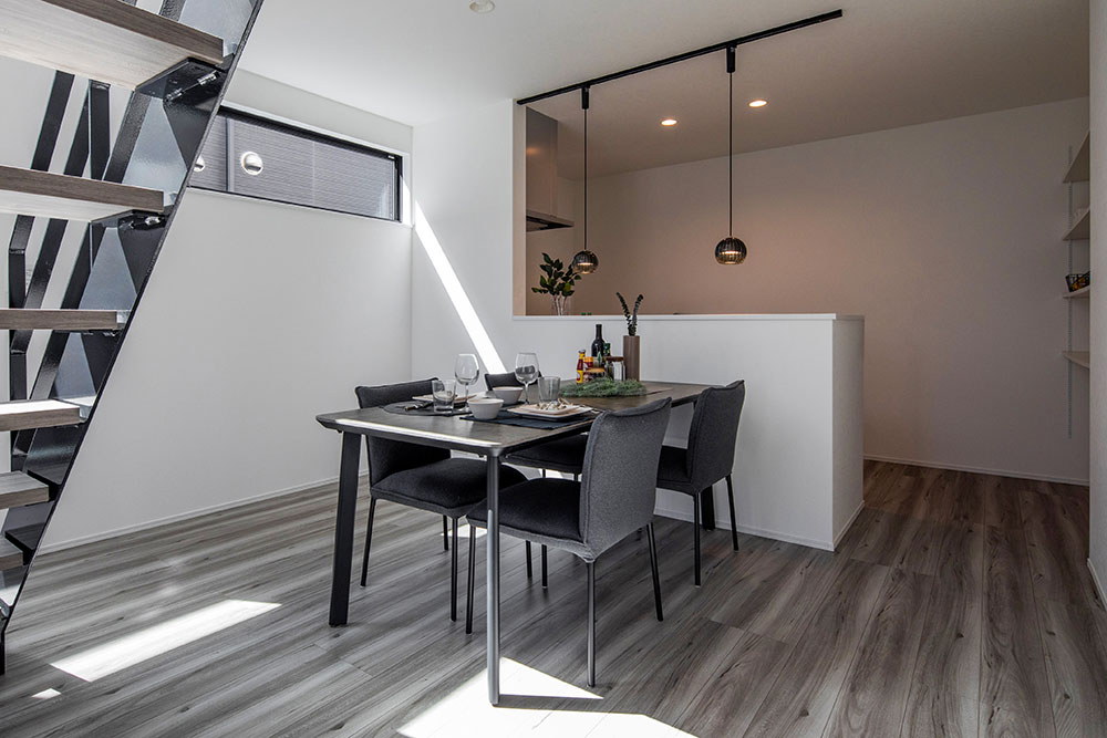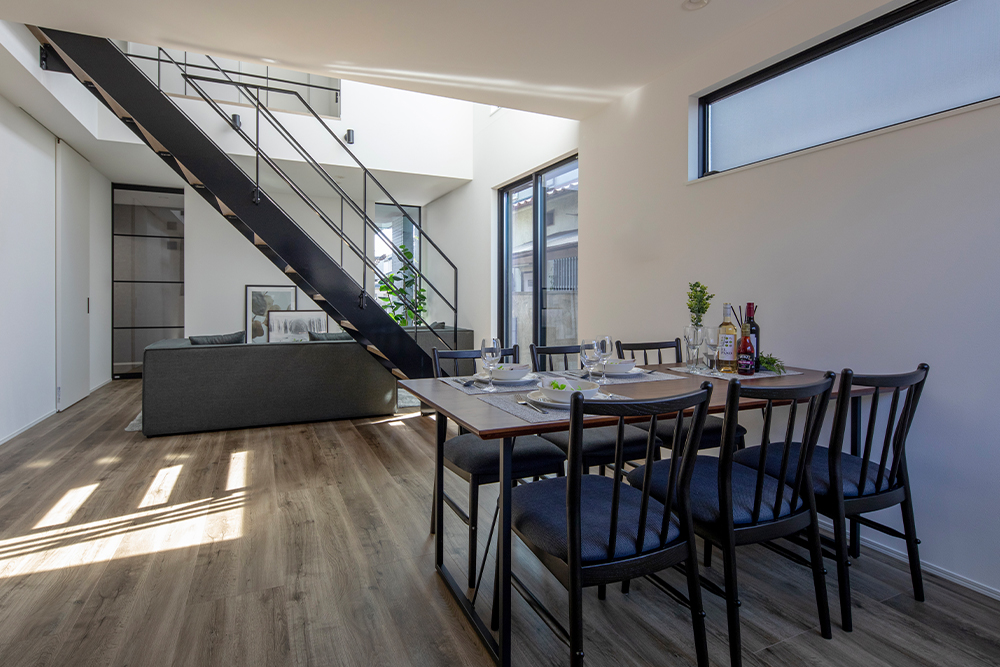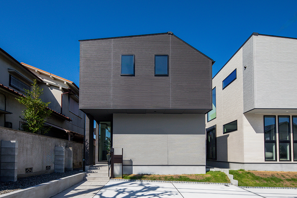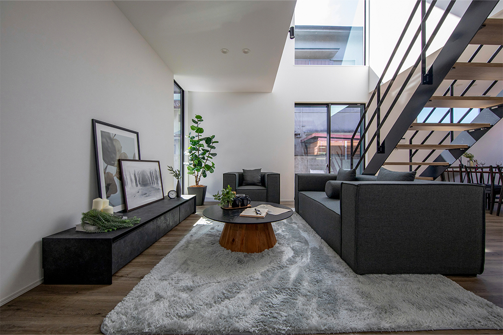 前面道路の幅員が12mあるため、開放的で車の出し入れがしやすい立地。両号地ともにLDKの中心に鉄骨階段と吹抜けを設け、穏やかな陽だまりをつくるメイン空間に。2階に上がる際にはLDKを必ず通るため、家族とのコミュニケーションをとりやすいプランニングです。また、水廻りも隣接させることで、帰宅時や家事の動線にも配慮しました。