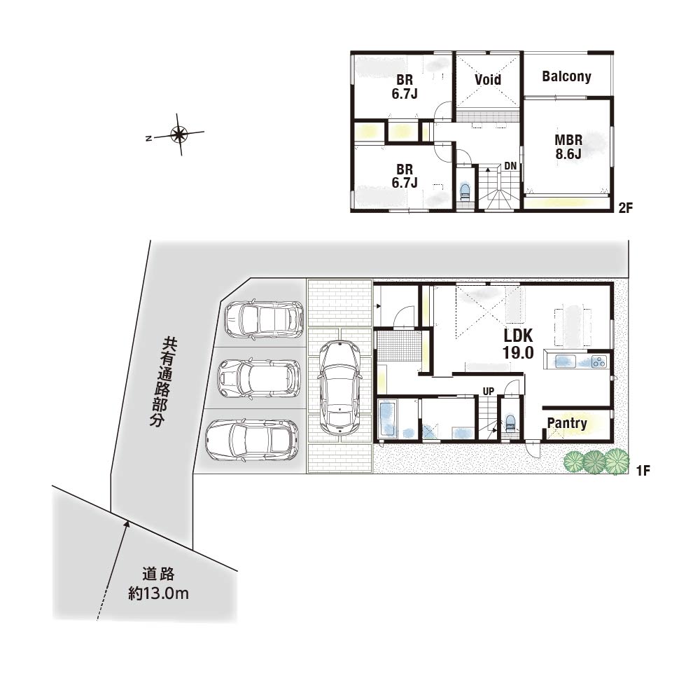 LDKはゆったりと過ごせる広さを確保し、リビング上部には各階を繋ぐ吹抜けを設けました。またキッチンには冷蔵庫も配置できる大容量のパントリーを設けることで、食品のストックや調理器具をスッキリと片付けることができます。2階の吹抜け部分には、趣味の読書やリモートワークに活用できるスタディースペースを完備。1階に家族の気配を感じる安心感がありながら集中して作業ができます。また収納付きの寝室を3室用意しているため、お子さまが2人いるご家族の場合、各々の部屋を確保できます。