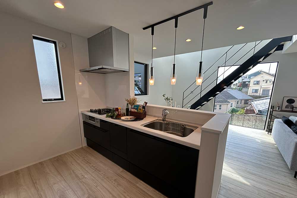 陽当りや風通りのいい四方空きの土地に計画された開放的な住まい。LDKは上部に吹抜けを設け、自然光が差し込む明るい居室になりました。また、2階への移動には必ずLDKを経由するように設計されているため、家族が自然と集まる空間になります。
