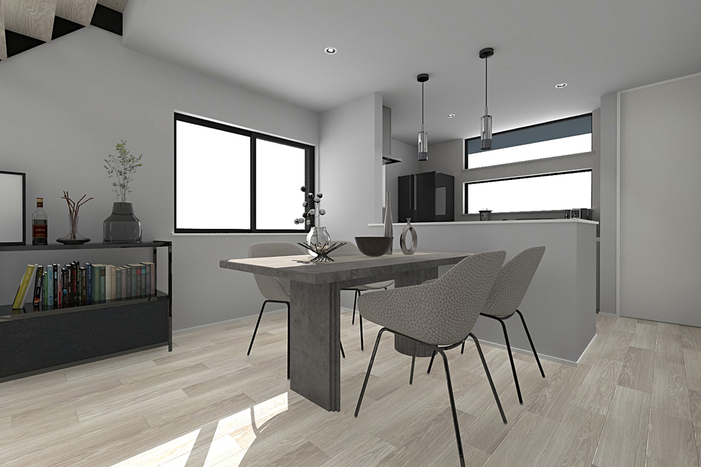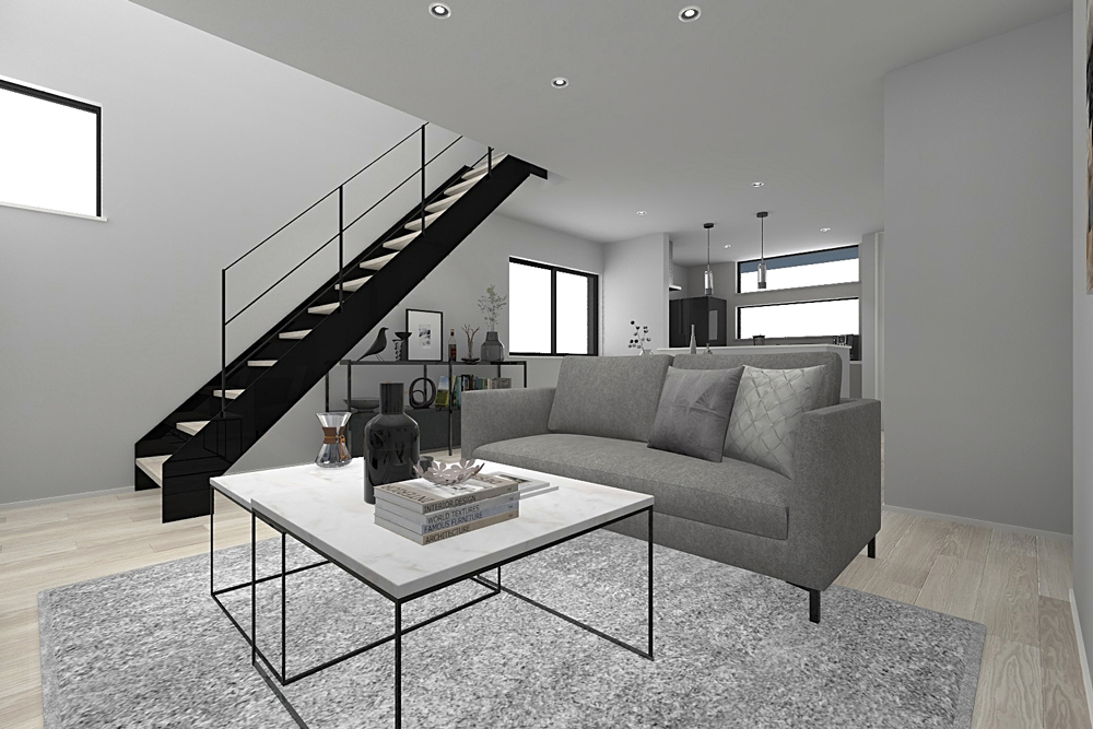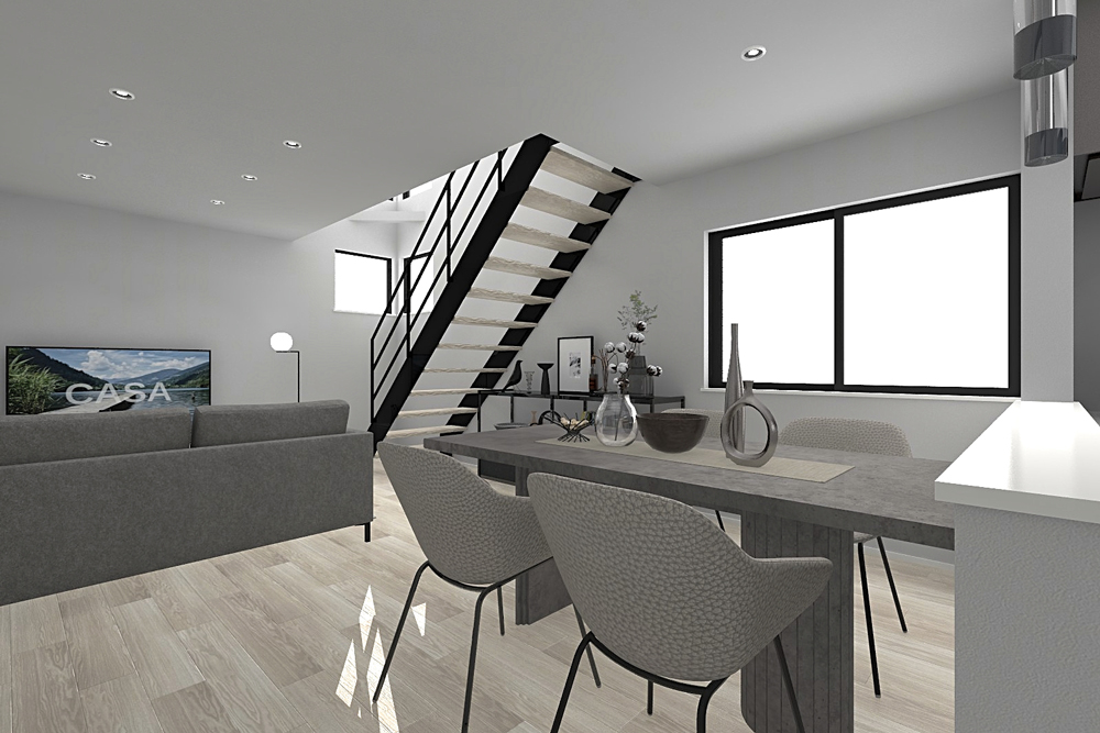 LDKは空間が一続きになった見通しのよい設計。お子様がどこにいても目が届きやすく、安心して過ごせる間取りです。リビングを通るよう階段を設置し、家族が自然と顔を合わせる導線に。日々の暮らしの中で、ふとした会話が生まれる、ぬくもりのメイン空間を演出します。