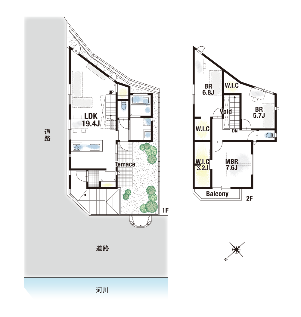 角地の開放感と道路との高低差を活かしたプライベートハウス。ひと続きで見通しの良い直線型LDKは、お子さまの様子を見守るのに最適です。そして、家族が心地よく休らうことができる庭付きのテラスがあり、園芸やバーベキューなど多様な楽しみ方で暮らしを彩ります。2階の居室は全室W.I.C付きの便利仕様。衣類だけでなく、スーツケースやゴルフバッグなど大きなものも収納可能です。また、駐車スペースは掘込車庫になっており、大切な愛車を雨風から守ります。