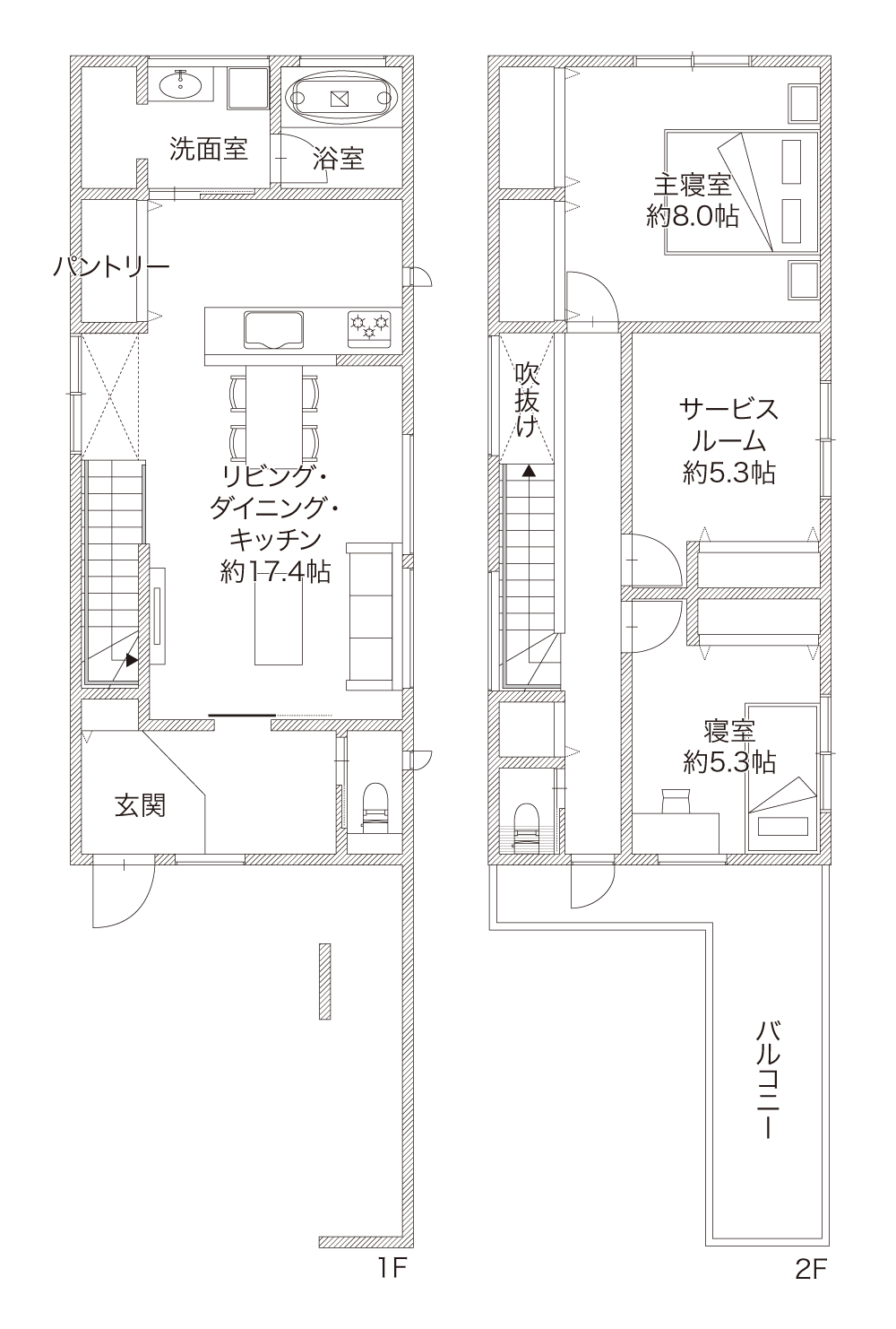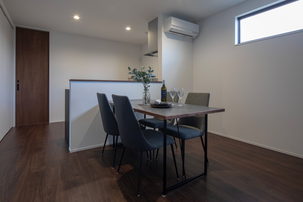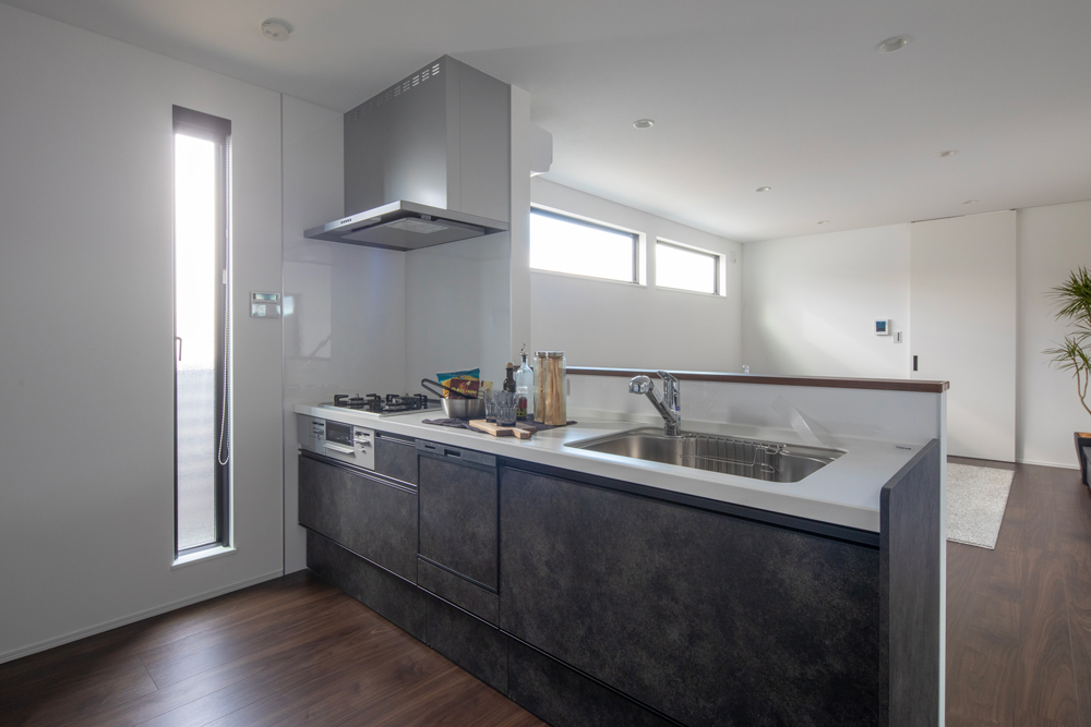 ふれあいの機会を創出する動線設計と見通しのいい開放的なメイン空間。 パントリーなど収納スペースを豊富に備え、日々の暮らしにゆとりをもたらします。 機能性と心地よさを兼ね備え、穏やかな時間が流れる住まいです。