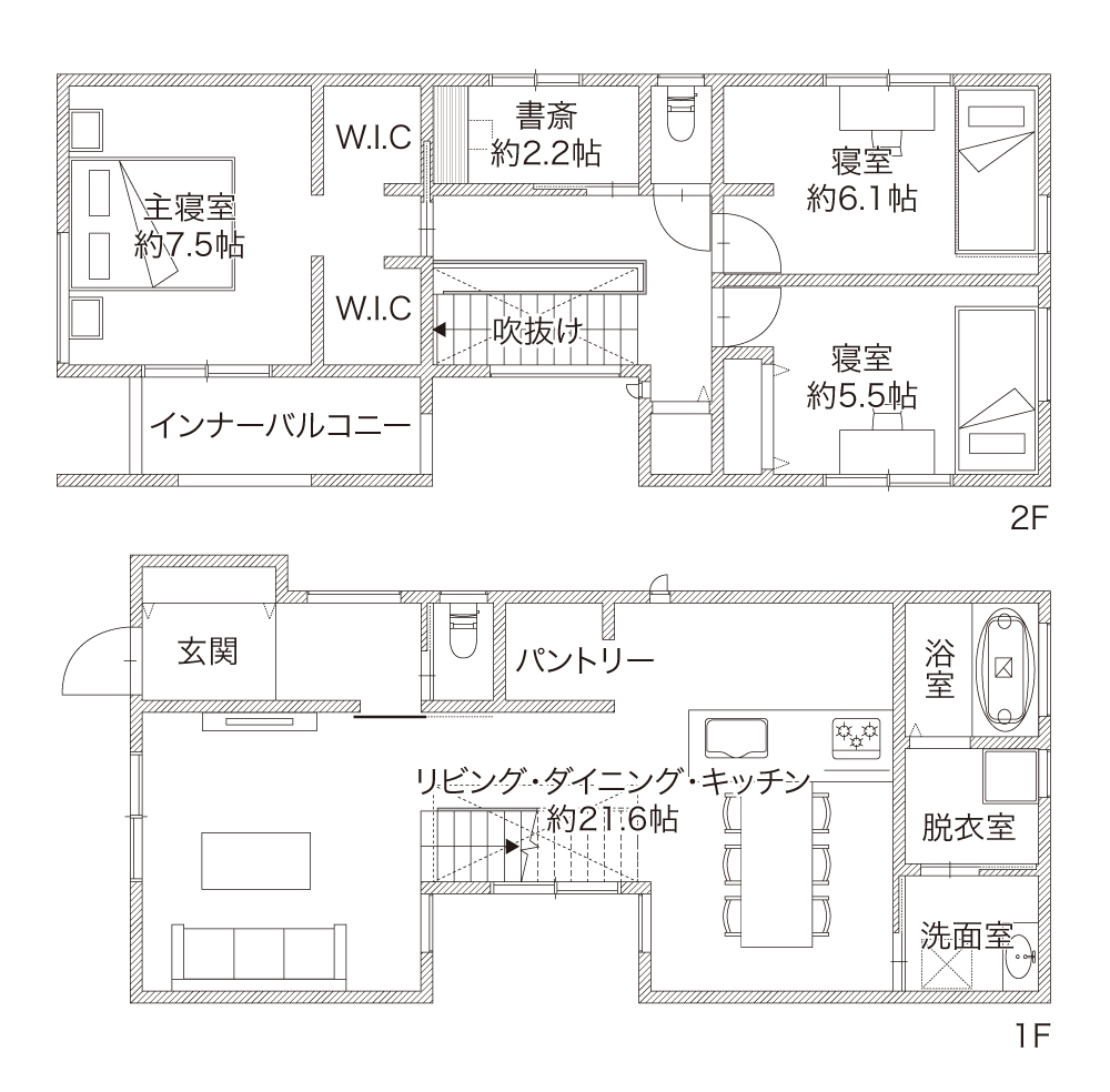 緩やかに空間を区切ることで生活シーンにメリハリを与える、「コの字型」を採用したLDK。 中央に設けたリビング階段は、上下階をつなぐだけでなく、家族との会話が自然と交差する場所に。 インテリアはナチュラルなもので統一し、穏やかなぬくもりに満ちた邸宅となりました。