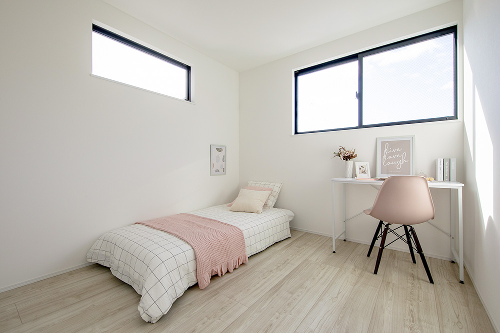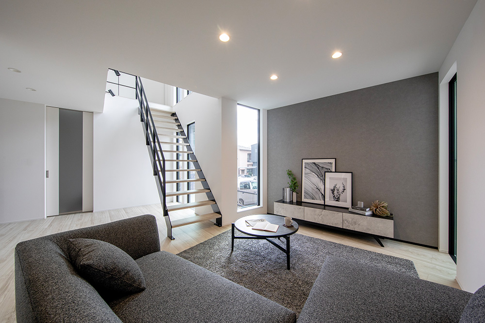 リビング階段を中心にL字型に広がるLDKは、空間を緩やかに繋げ開放感と一体感を生み出しています。 インテリアからアクセントクロスまでグレートーンで統一することで、落ち着きのある佇まいに。 充実した収納スペースが日々の暮らしをすっきりと整え、心が安らぐ上質な邸宅です。